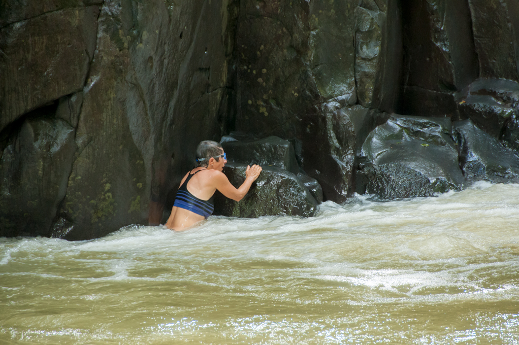 On another day the Terns and Takks caught a maxi up to the NE village of Bense. From there we walked — first on a paved road, then on a dirt road, and finally through dense forest on a foot path that took us over a small river (jumping from rock to rock) and along another river that brought us to Chaudiere Pool. We had taken along swim goggles in the expectation of seeing fish in the pool, but alas, a construction project upstream had clouded the river with mud. Not to be deterred, Barb got wet and the Terns got frisky, swimming against the strong current and jumping/diving into the deepest portion of the pool. I took pictures. 🙂