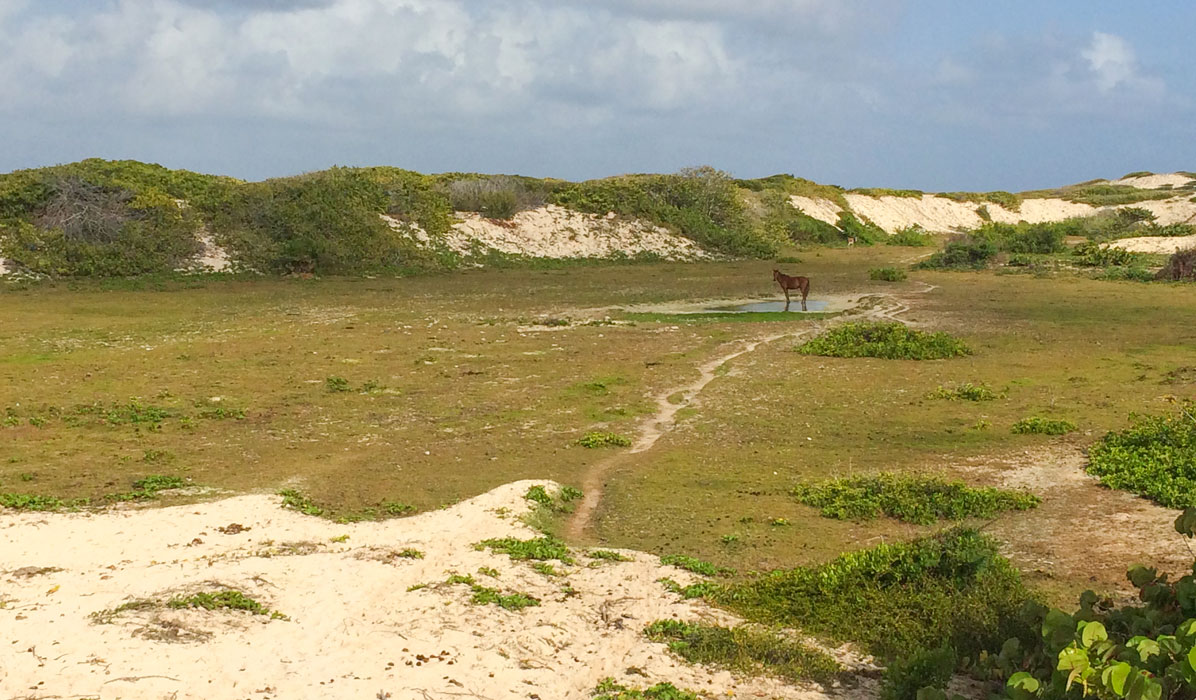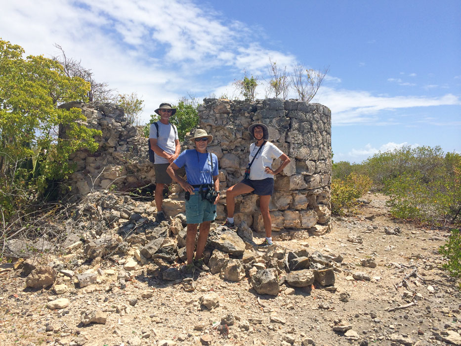 On one of her walks, Barb encountered a local “taxi” driver named Kenroy and asked him about getting a tour of the island. They communicated back and forth by phone a number of times, and ended up arranging for a tour on April 5. When almost our entire Armada wanted to go, Kenroy arranged for another van to come along to handle the “overflow”. We were picked up at Spanish Point, and after a very bumpy 40-minute drive into Codrington, we drove up to the vicinity of the ruins of the Codrington Estate house in the Highlands. After viewing the ruins, we did a 45-minute walk through the brush to the Darby sinkhole, a crater some 30 feet deep and 100 yards in diameter. Most of the sides are sheer, but there is one place on the south end where one can scramble down to the cool, dense, tropical vegetated flat bottom with its own ecosystem. On some of the overhanging cliffs one can see bats suspended overhead. No visitor to Barbuda should miss this site!