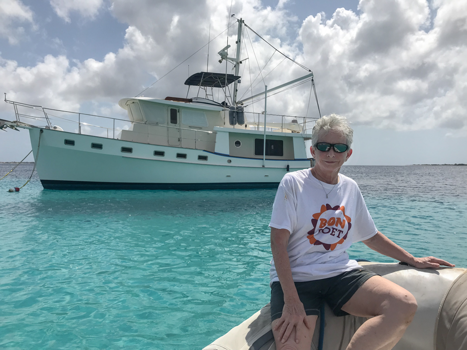 Our very good friend Bill (nee Dolce Vita) offered to join us for the passage, and we accepted at once; he arrived several weeks before our planned departure, the better to enjoy Bonaire one last time and to help with the preparations and to be present when a weather window appeared. Even before his arrival, I had begun preparations by opening up the middle fuel tank in order to see if it needed cleaning after our 14 years of use. It was remarkably clean, presumably due to our habit of always running the built-in fuel cleaning system whenever we were underway. When he arrived, we prophylactically took apart the stabilizers in order to check the condition of the trunions supporting the hydraulic cylinders. We replaced the John Deere serpentine belt, and I changed the JD oil and filter.
