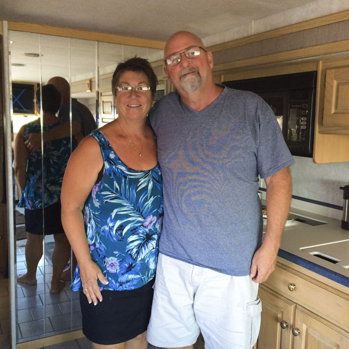Bruce & Jan, long time friends of Bill & Colleen, often come for a visit, and they were there for some of the effort. Bruce is as much of a gear- and electronics-head as Bill. They had parked their “new” 43′ Allegro Bus, purchased just after we bought ours, at the extra electric pedestal and sewer line that Bill installed near the garage.