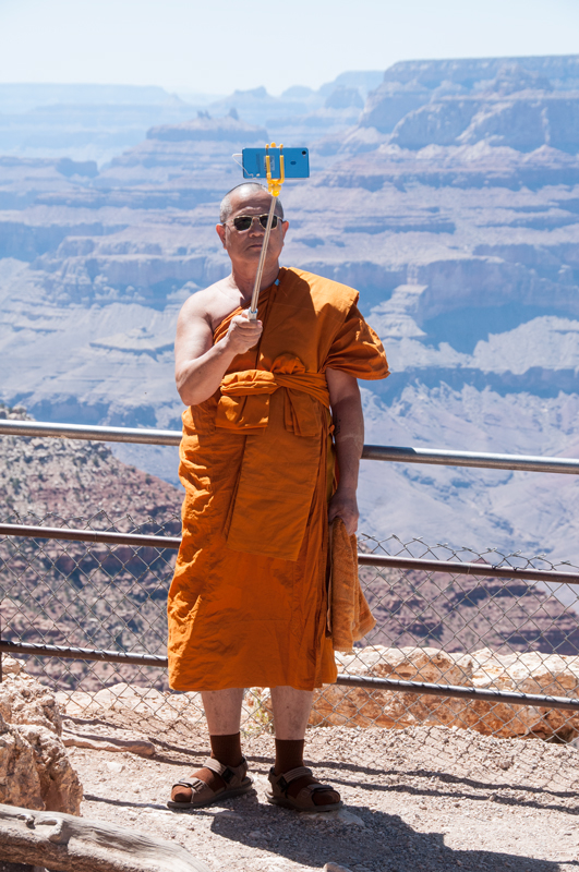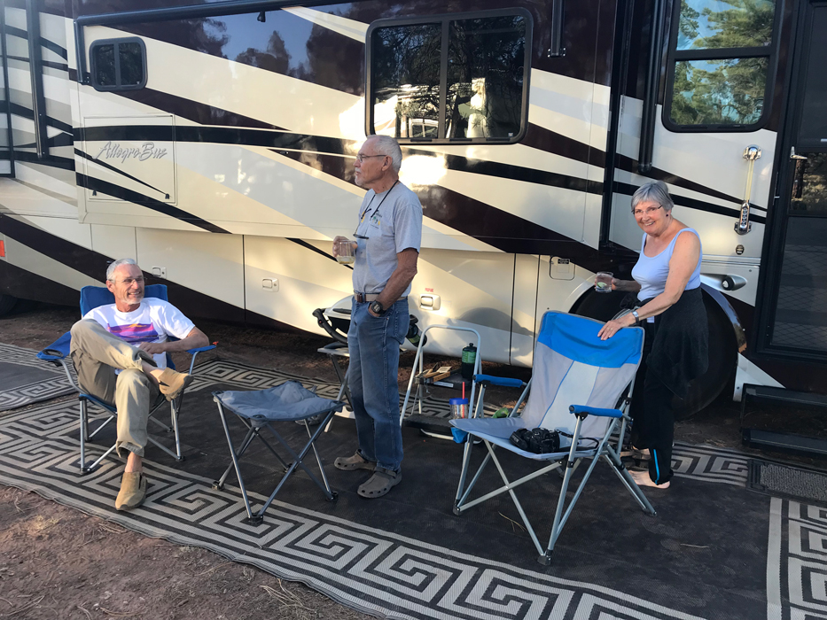 We had a thoroughly enjoyable time during our visit with Bill & Colleen.  All of it.  But the highlight of the visit has to be our multi-day camping trip to the southern rim of Grand Canyon.  Bill & Colleen own a perfectly comfortable and commodious fifth wheel camper, but as luck would have it, Bill’s boss had graciously offered Bill the use of his ginormous ShowHauler camper as a reward for Bill having found and fixed a number of problems with the beast.  Bill accepted, but delayed cashing in on the offer until we could arrive and share the bounty with him.  Have I mentioned that the ShowHauler is HUGE?  When we pulled into the parking lot of the IMAX theatre, we were immediately surrounded by at least 20 tourists who simply HAD to get a picture!