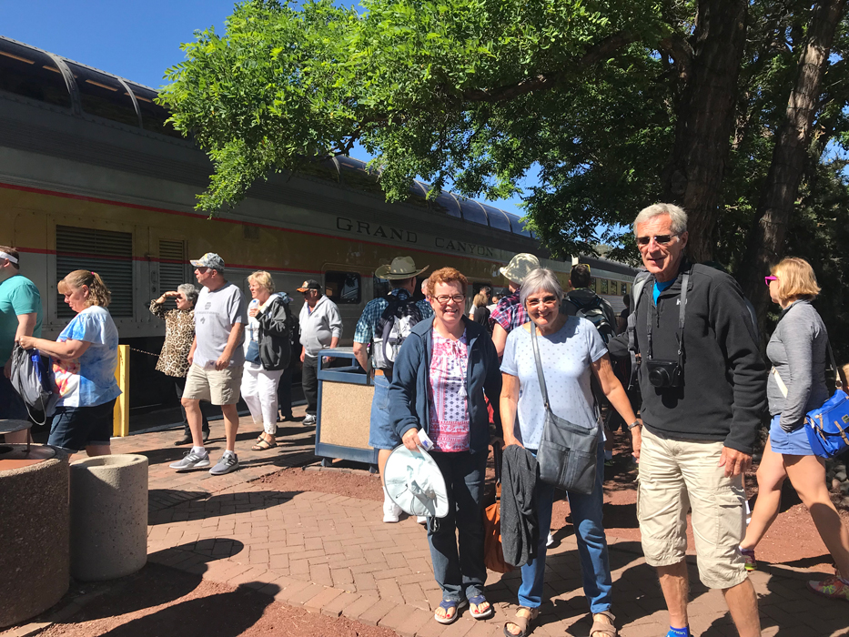 Joined by Buck in his own class A RV, we took our Allegro Buses up to “boondock” on National Forest land just a bit south of Grand Canyon.  We spent  three days there, taking our toads up to the South Rim.  Bill, Rasmus and Buck hiked down the Bright Angel Trail into the Canyon, descending all the way to Plateau Point.  And one evening we all splurged and enjoyed a wonderful meal at the historic El Tovar Lodge, which first opened for service in 1905.