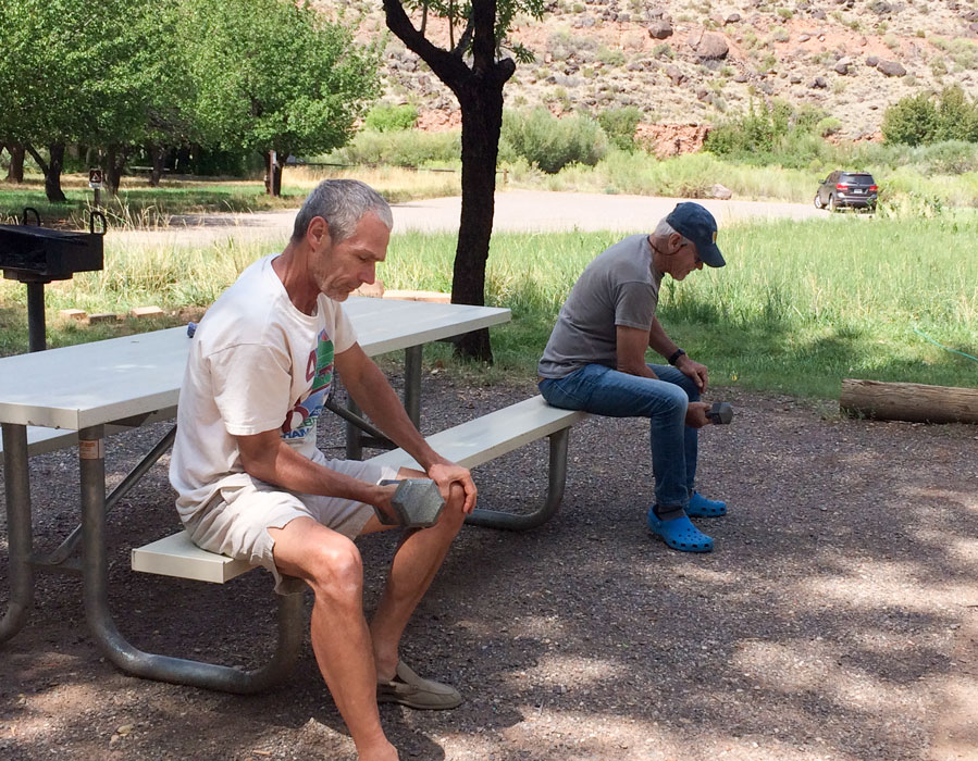 We love Capitol Reef National Park. But on our way we learned they had only one vacancy, so on 6/30 we stopped at Wonderland RV in Torrey, UT. Colleen and Bill took the opening at Capitol Reef, and we drove over to visit them. The Staff at Capital Reef advised that several sites would probably open up the next morning, and that if we appeared sufficiently early we would probably get one. However, we had to appear in person; Colleen could not sign us in. So Barb got up early and galloped ahead while I broke camp. The strategy worked; we were rewarded with adjoining sites and juicy apricots freshly picked from the long-ago Mormon-planted trees in the Park.