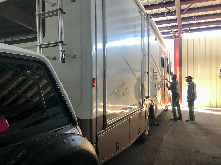 - Tracker pushed up to the wall; RV backed up to the Tracker