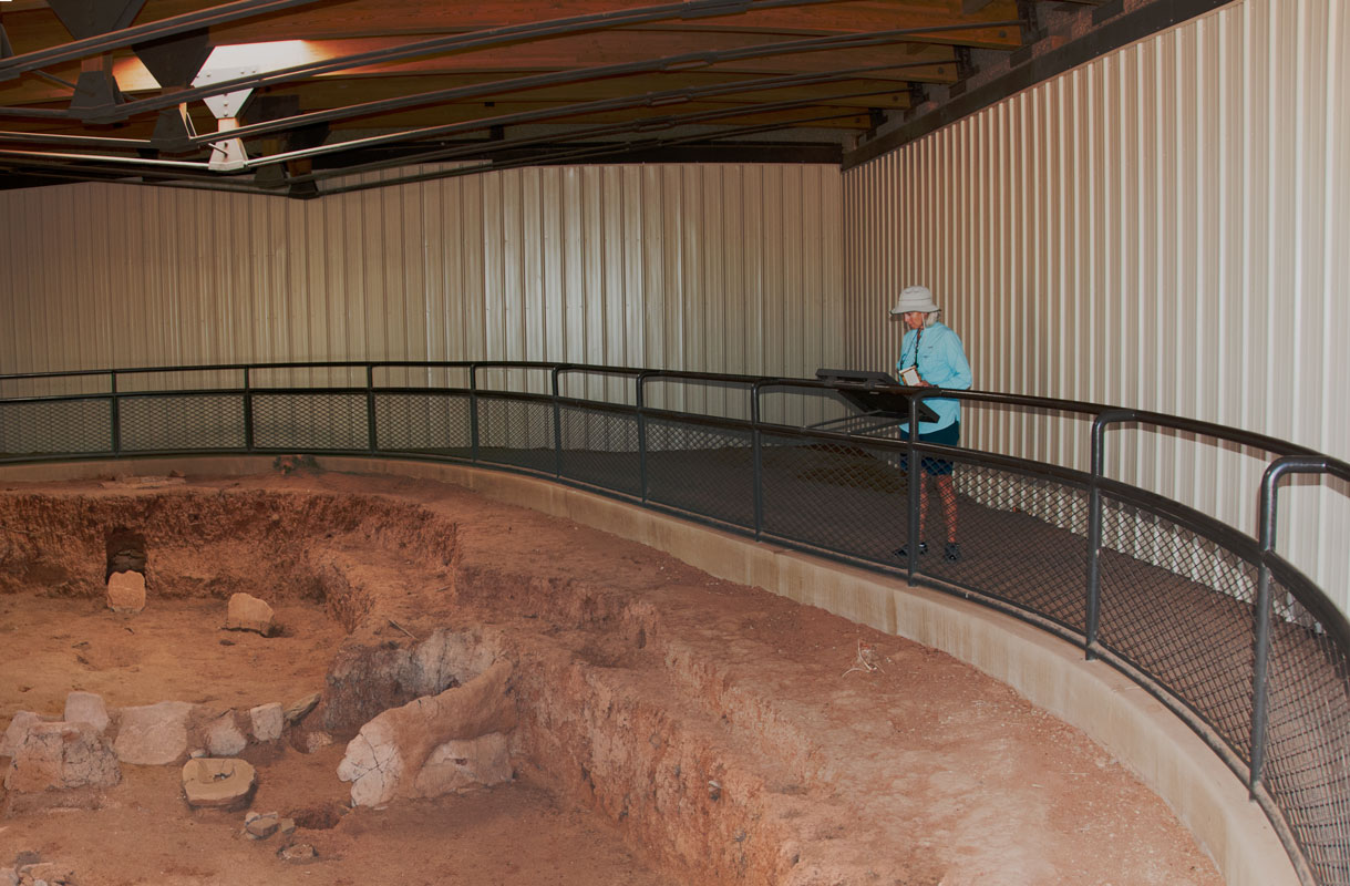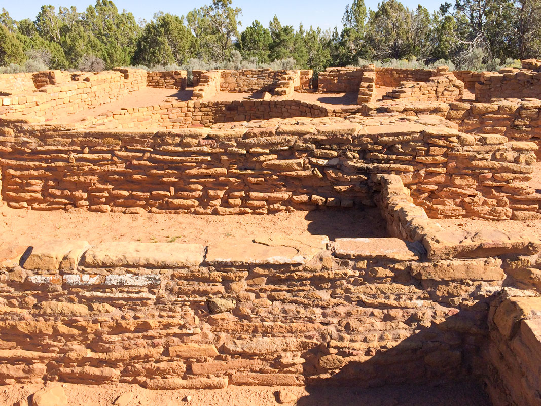 On our first full day of the visit, Barb and I joined a ranger-led tour of the “Cliff Palace” that required climbing four ladders.  We also visited “Spruce Tree House”, the best-preserved dwelling and one that permitted self-guiding.  There, we climbed down into a kiva whose roof had been restored.  We also took our car on the Mesa Top Loop Drive that took us to a number of early pit house sites and also to a number of canyon overlooks from which we could look across to other cliff dwellings.  Near the end of that loop was Sun Point View from which a dozen cliff dwellings are visible, as well as the mesa-top building called Sun Temple across the canyon.  A short ride later, we were at the intriguing Temple itself, a large D-shaped structure whose four-foot-thick walls feature stones onto almost all of which texture has been carefully pecked.  Neither household goods nor roof beams have been found, indicating that the structure of nearly 30 rooms was probably never finished.  Why was it abandoned?  Indeed, why were the cliff dwellings in the alcoves below also abandoned?  No one knows for sure.