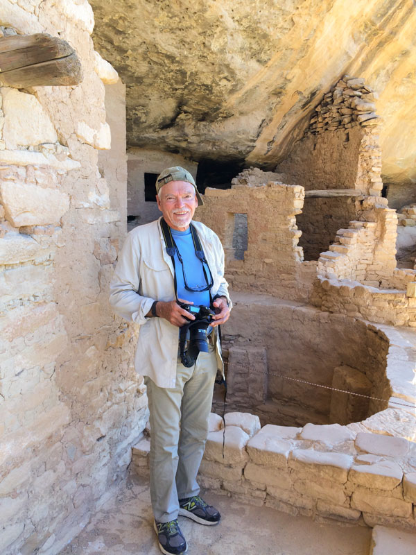 Barb and I spent a fascinating day exploring the ruins in the Mesa Verde National Park in Colorado.  We arrived at the campground the night before and got oriented at the Visitor Center.  We learned that some 4500 archeological sites have been discovered, of which about 600 are the iconic cliff dwellings.  “Mesa Verde” means “green table” in Spanish.  The name derives from the vegetation that thrives on the top of the plateau or mesa of the region.  Actually, the words should be plural, since the original prehistoric solid mesa was already carved into a large number of mesas separated by deep canyons by the time the ancestors of the current native peoples settled there about AD 550.  Archeological research has revealed much about the ancestors, originally called Anasazi – a Navaho word roughly translated as “the ancient foreigners” – but now called Ancestral Pueblo people to reflect their modern descendants.  The archeological evidence reveals the gradual development of increasingly sophisticated lifestyles.  From the beginning they farmed corn, beans and squash on the mesa tops and hunted wild animals and built pit houses on mesas and in cliff alcoves. They gradually became prolific potters and advanced from using the atlatl to throw spears to using the bow and arrow.  By about AD 750 they began building houses above ground with upright walls fashioned from poles and mud, often with a pit house or two in front.  Later the pit houses evolved into kivas.  Kiva is a Hopi word and refers to round chambers built in a fairly standardized fashion that features a separate ventilation shaft that opens into the kiva and delivers fresh air to a fire pit located centrally on the floor.  Between the shaft opening and the fire pit there was an air deflector that protected the fire and increased circulation and encouraged the smoke to rise up through the hole in the roof that was also used for access into the kiva by way of a ladder.  Another standard feature was the existence of a sipapu – a hole in the floor that related to the belief that people had entered the world through such a hole in the beginning.  In modern Pueblo communities the kiva is still an important ceremonial structure.