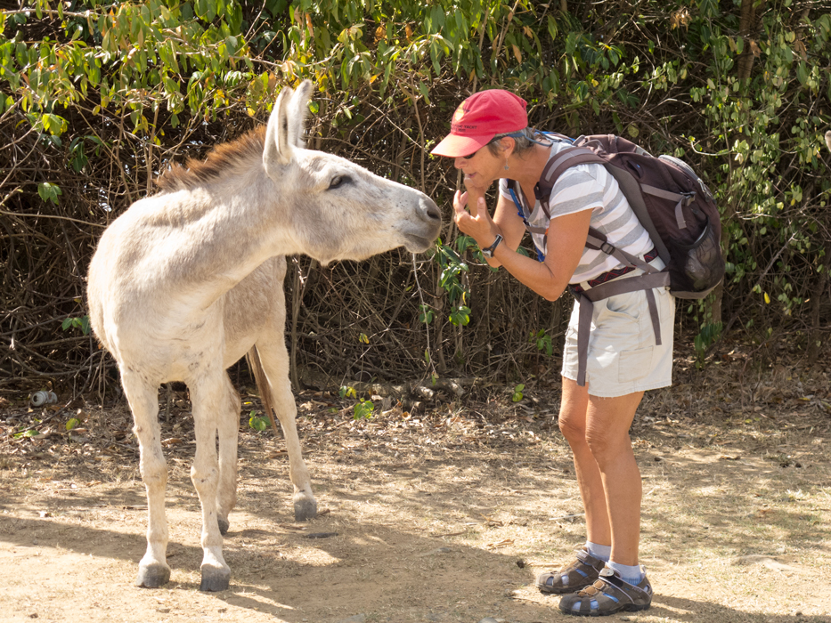 While in Francis Bay, Barb took our guests on a walk to the Annaberg Ruins, where they were fortunate to arrive during an expo day.  On Friday night we again partook of the gluttonous meal at Maho Resort, and afterwards watched in fascination as a guest glass blower created a gnarled tree complete with green foliage.  On another day we all joined Hunter and Devi (Arctic Tern) and their guests Craig and Sharon on a hike over the Johnny Horn trail from Waterlemon to Coral Bay and back.   While in Coral Bay we had breakfast at the Donkey Diner, and then walked down to the little grocery store “Love City Mini Market”, which “has everything”.
