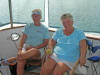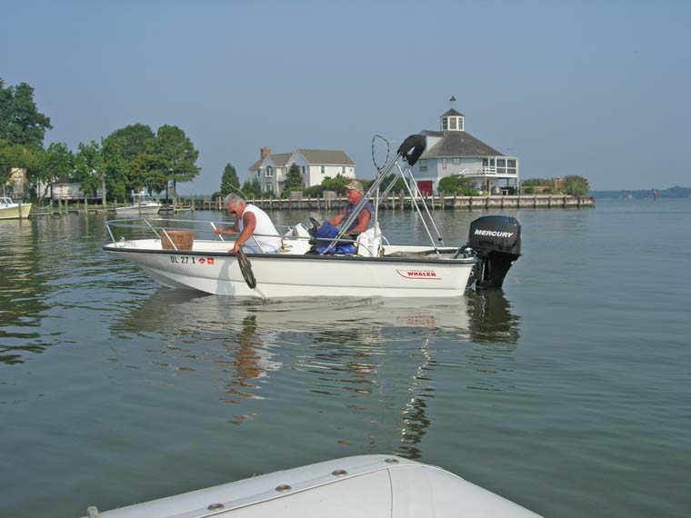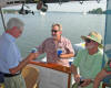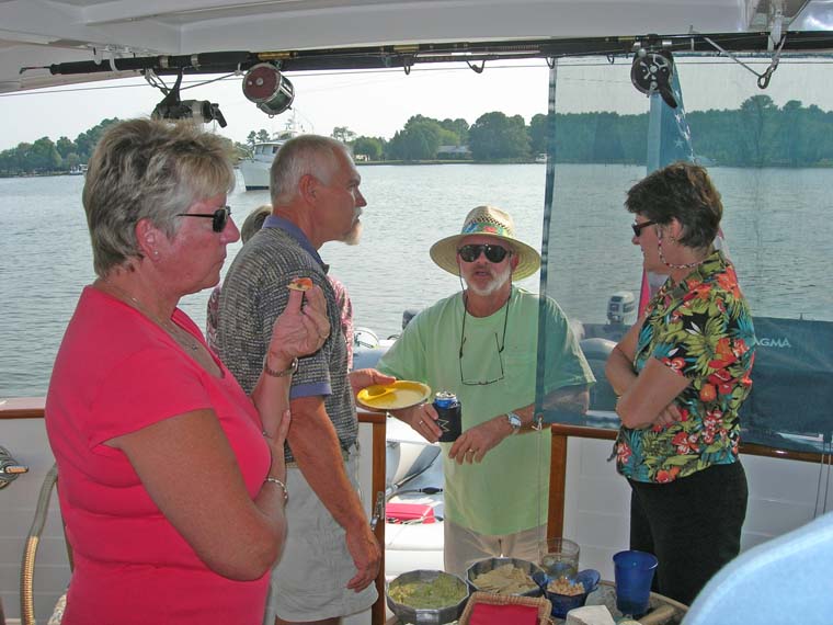 Three boats left the next day, but Friendship and Morning Star and Tusen Takk II persisted. On 8/26 we took our dinghy in to watch a "log canoe" sailboat race whose venue was just south of Oxford. Log canoe sailboats, I believe, are an historic design unique to the Chesapeake. Very long and narrow, the crafts are fashioned out of relatively few long "logs", joined in parallel, and hollowed out until all that remains is a sailboat! They are too narrow for the crew to provide much counter weight by sitting on the gunnels, and so the boats are equipped with movable planks out upon which the crew can crawl. The boats are extremely handsome, and very sporty with their topsails. Afterwards, we joined Randy and Cindy of Morning Star for a drink at the poolside of Mears Yacht Haven, where they had situated themselves, the better to receive and entertain Cindy's sister.