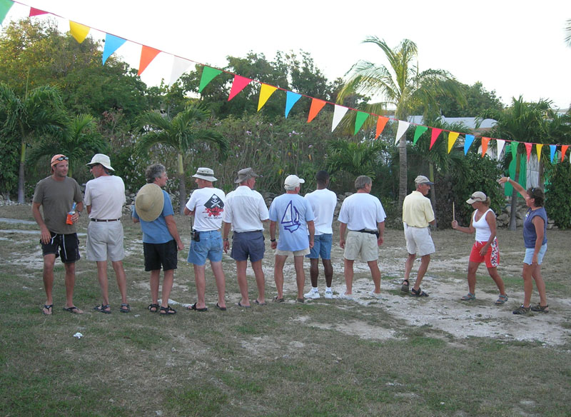 We decided to attend the "5F" festival at Big Farmer's Cay 20 miles south of Staniel -- the "Farmer's First Friday in February Festival." We didn't get to Farmer's until after 3:00 pm, and so missed the wet t-shirt contest -- much to Chuck's dismay. But we were there for the men's best legs and buns contest -- much to Barb's delight. (See photos below.) The festival was not at all what we had expected, but it was fun to watch and participate. There were lots of families: boaters as well as locals from Little Farmer's and surrounding islands. The festival had two sites of blaring music. One was playing rap music and we were truly amazed at the obscene lyrics being enjoyed by the locals -- including children. The other site, the famous Ocean Cabin, featured Bahamian music. A sign on the outside of Ocean Cabin says: