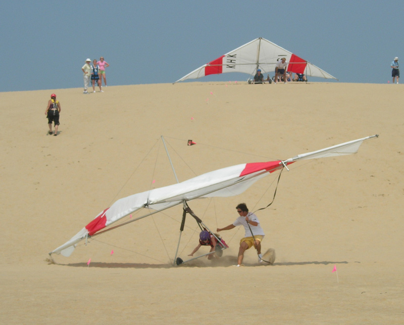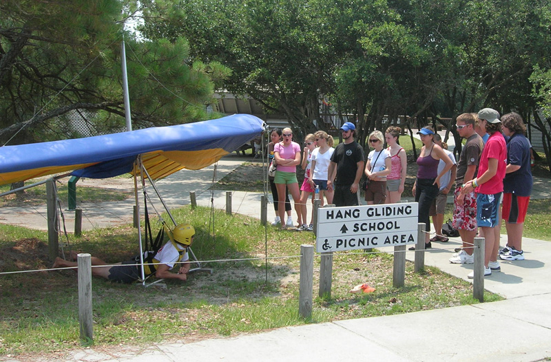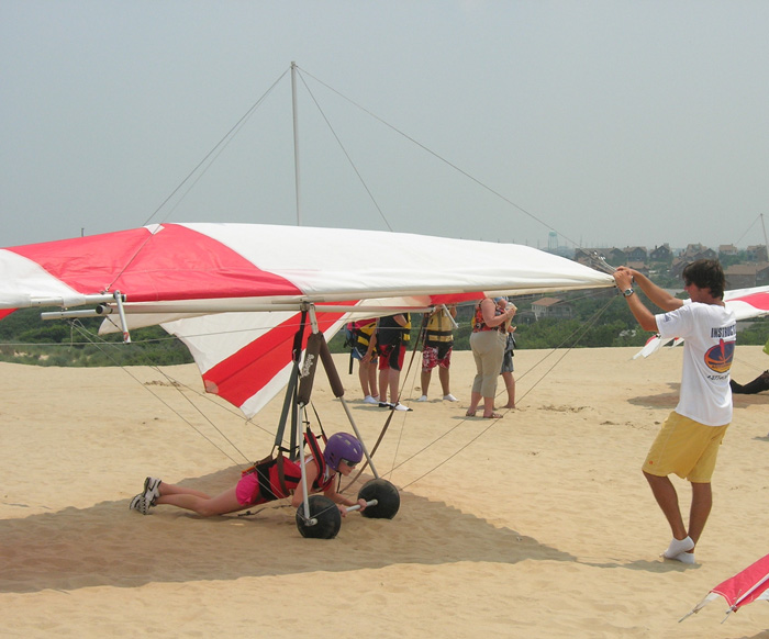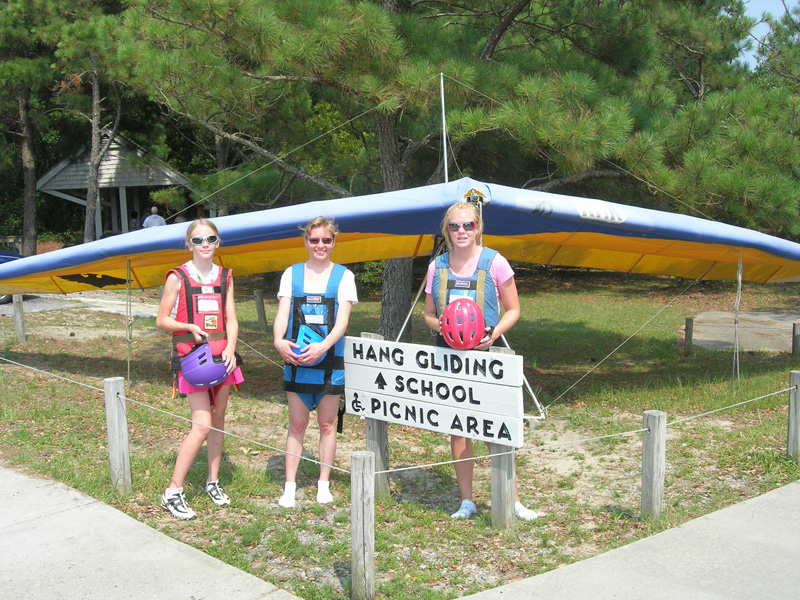 We spent the first day of the visit exploring Manteo and checking out all the shops. With four females Chuck was outnumbered but he hung in there with them for a few hours until he could take no more. They later found him comfortably seated in the local book store catching up on his reading. That evening we all went to see the play "The Lost Colony". It was very professionally done, and we all enjoyed it. The next day we headed to Jockey Ridge for hang gliding lessons for Nellie, Katie and Jessie. In addition to a lecture and a video, they each got five flights while Chuck and Barb photographed. We had a great time with them. Nellie brought along a number of interesting and entertaining DVDs, so bedtime tended to come rather late. One afternoon we took the dinghy over to a small island nearby for some swimming. Since they left on the afternoon of the 4th -- Nellie needed to be back to work the next morning -- they missed an awesome fireworks display that evening. We were docked on the outside face dock, and the fireworks were just across the river. We invited our dock neighbors to join us on our upper deck for what had to be one of the better vantage points along the river front.