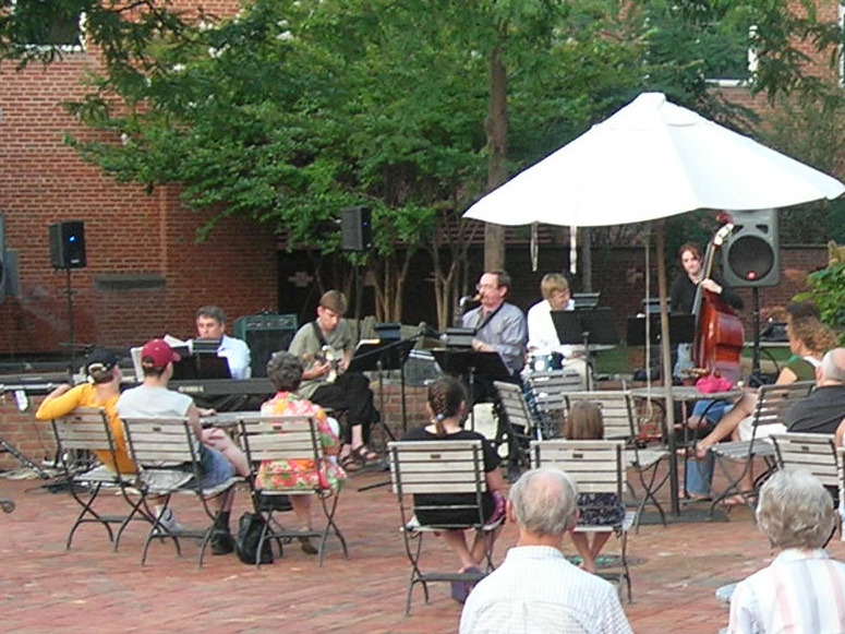 After leaving Manteo 7/5 we spent a night at Coinjock, where we enjoyed their 32 oz. "prime rib for two". I'm sure that's why many boaters stop there, since it is awesome. (That, and the fact that it is a.) at a natural stopping point in terms of distance, and b.) in the middle of nowhere.) The next day we had extraordinary luck as we made it through the many bridges between Norfolk and Coinjock in record time. We had planned to stop and anchor at Hospital Point in Norfolk, but decided to keep going as we were passing through only shortly after noon. When we entered the Chesapeake we found fairly rough seas, since the wind was howling out of the north, but we plowed through it all with our stabilizers keeping us reasonably comfy. We ended up anchoring in the Severn at the southwestern end of Mobjack Bay that night and made it to St. Mary's the next night. We had a layover day in St. Mary's before heading to Washington, DC. As we've written before, what a scenic and peaceful anchorage. Chuck got in a nice long run, we got some boat chores done, and on the evening of 7/8 we dinghied in to enjoy a jazz concert on the patio of the student center of St. Mary's College of Maryland.