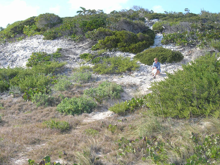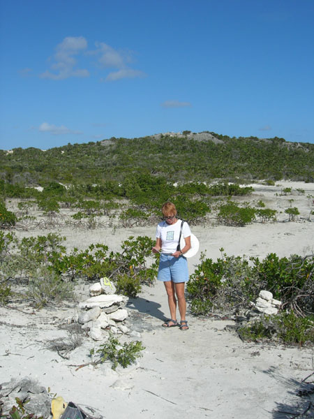 The next morning we were ready to leave and find some better shelter from the 25 to 30 knot winds. We decided to head to the west side of Norman's or into a western anchorage on Shroud Cay. Seaclusion and Dream Weaver were considering heading to Warderick Wells, but agreed to head to Shroud Cay with us. Because it was less than five miles and the wind was so strong, we decided to tow the dinghies the short distance. While underway a call was made to Warderick Wells to make a reservation for the three boats and when they had space for us today, a decision was made to press on the additional 20 miles to the Exuma Land and Sea Park. Actually the guys made the decision, although Chuck was reluctant and Barb did not agree with it. After a few more miles the seas really kicked up and we were slamming into six to seven foot seas with the dinghies bouncing all over. When the dinghy on Dream Weaver came loose and Paul had to risk his life retrieving it, Barb spent much of the rest of the trip muttering and cursing about sticking to her guns next time. Luckily, all ended up well and the trawlers were safely moored in the Park at Warderick Wells shortly after noon. We spent the afternoon exploring a bit of the island, including a walk up to the peak of "Boo Boo Hill", where cruisers for years have been leaving pieces of driftwood emblazoned with their boat names. Later we prepared a snack and took it and our drinks to the traditional Saturday sundown beach "happy hour" party hosted by the Park (they provide ice), where we chatted (and nibbled and drank) until well after dark with the owners of the other vessels moored in the Park anchorage. Most of those vessels are sailboats, by the way, and most of the owners are Canadian.