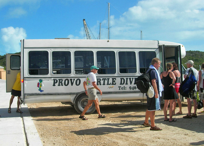 The Turks and Caicos are a world-famous dive destination, and so we couldn't imagine spending some time here and not diving. We booked a two-tank dive with Provo Turtle Divers, and were told to be at their Turtle Cove office at 8 AM. So we called our mini-bus operator the night before, and arranged to be picked up at the beach used for landing dinghies from the anchorage. On the morning of the dive, just as I was getting into the dinghy, I saw him arrive and flash his lights, and then leave. Yikes. Will we get to the dive shop in time? Frantic attempts to get a satellite phone connection to ask him to come back and pick us up. Finally get through, and we are told that it will be 30 minutes before he can get there. Barb tells him that won't work for us -- we must be to the dive office before that. He reluctantly agrees to come in 15, and then takes over 45 to get there. During that time we considered calling a taxi but didn't want to stand up the nice mini-bus driver. When the bus arrives it is nearly full, and the driver keeps turning off on side roads to drop folks off and pick others up -- including kids heading for school -- so he apparently has a regular set of customers. The mini-bus is often full to the bursting, and we have taken up valuable space with our dive bags. Finally we are headed in the right direction and arrive at the dive office just in time to sign the appropriate releases and jump aboard the dive bus that will take us to the dive boat on the south end of Provo. We had a 50-minute fast boat ride out to West Caicos, where we dove at two different wall locations. The dives were good -- especially the first. But you know what? We've seen as many fish on the reefs off Boynton Beach, FL, and we've seen more alive and spectacular walls off Bonaire. And in keeping with my comment earlier about Provo costs: the dives were expensive.