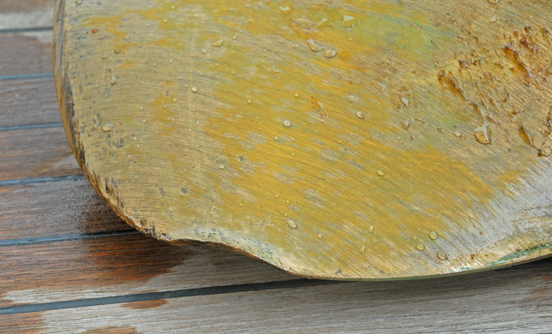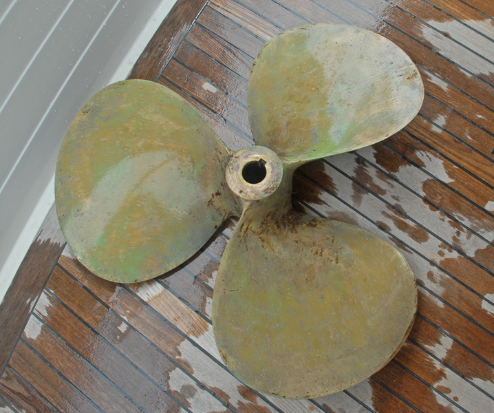 We anchor in Prickly Bay, and the Admiral immediately dons snorkel and mask and checks the stabilizing fins and propeller for damage. She returns to the boat reporting that she could see no damage. Later, she clarifies that since she had not used any weights, she had trouble getting down deep enough to see much in the murky water. Chuck dons snorkel, mask, and weights and finds that all three blades of the prop have a noticeable distortion.