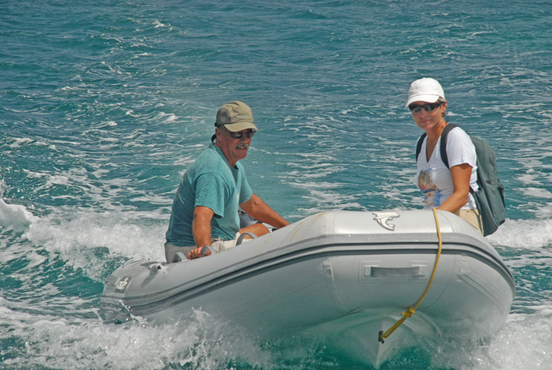 There are boat boys in the harbor, offering wine or bread or mangrove oysters, but they are pleasant and don't pester. Chuck finds a running route that takes him one mile up a concrete road and then another mile on a narrow dirt road that winds up and down along brush-filled pastures with goats and sheep, along turquoise seashores and under manchineel (Poisonwood) trees. The road stops at an abandoned house at the end of Southwest Point. Two miles out and two miles back makes for a pleasant run.