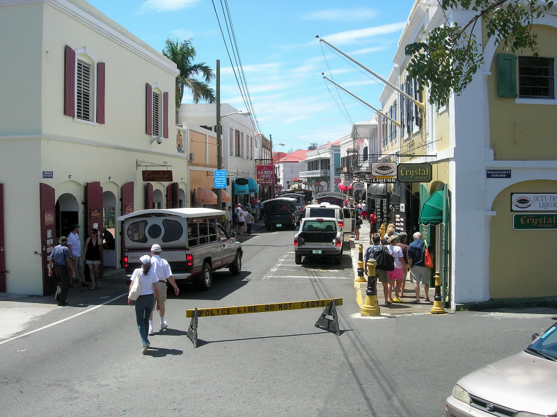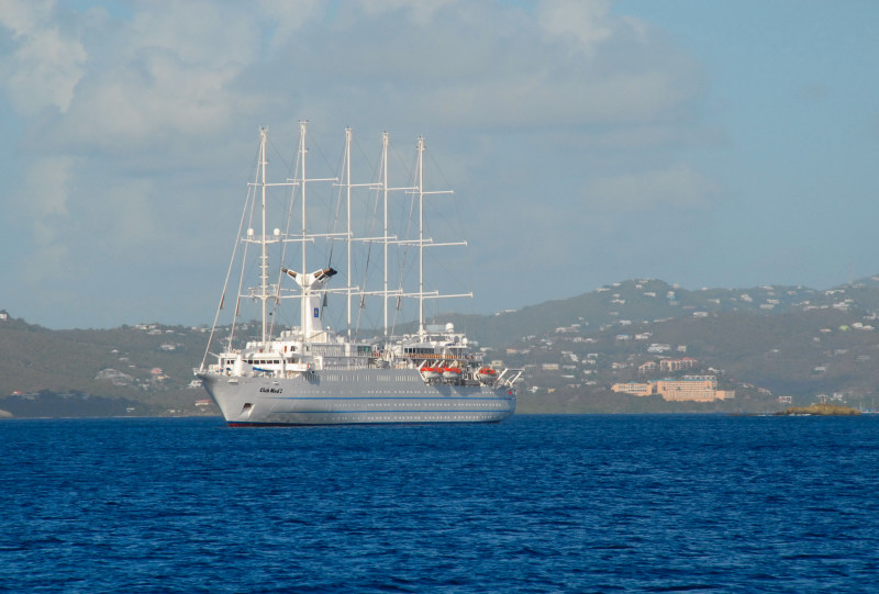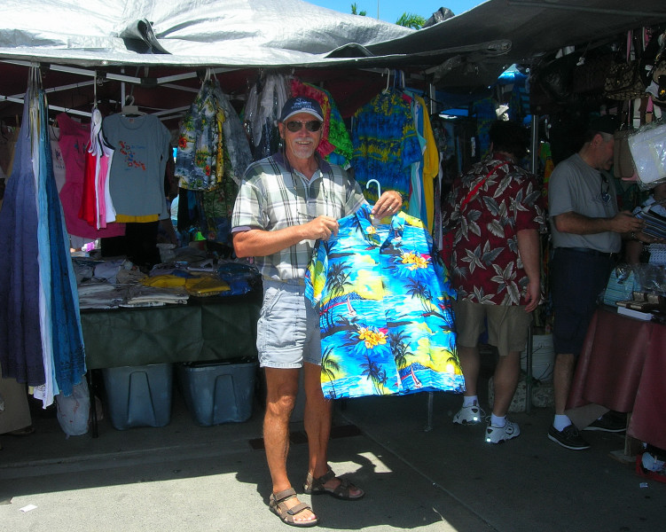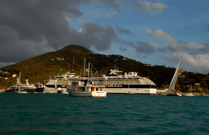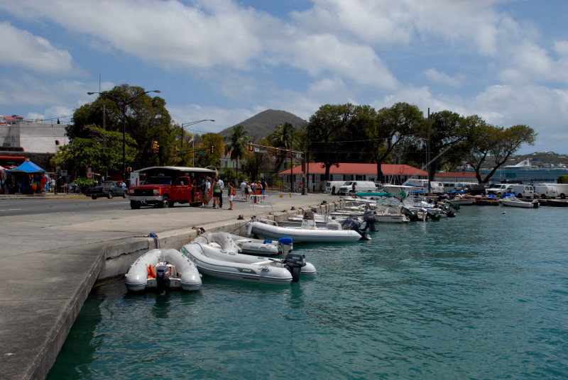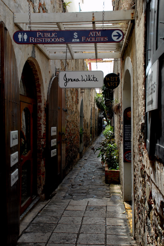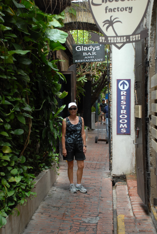 Just south of our anchorage was a huge dock that accepted a minimum of three new gigantic cruise ships every morning. Gigantic, as in humongous. They departed every evening at dusk. What fun for the passengers would cruising in the dark be? Save your money, friends, and come cruising instead with us! We cruise in the daytime mostly, and only use night passages on stretches that you would probably want to avoid anyway (unless you are exceptionally adventuresome.) The cruise ships brought thousands and thousands of would-be shoppers to shore every day for the duty-free shopping, and Charlotte Amalie was prepared! Of course we walked through the shop district, and of course we expected to see fancy clothing and jewelry stores and liquor stores, etc. What we did not expect was the magnitude of the district, and the density of the above-mentioned shops. There was a multiple-block stretch in which every other shop featured expensive jewelry. Amazing. And there were a number of watch and camera shops as well. And, um, I have kinda been wanting to get a really good SLR digital camera. I have some really nice lenses for my Nikon film camera, and film is just so passé, don’t you think? So, um, I asked a few questions and then did a little web research about prices, and, um, then on a day when the store was so filled with cruise-ship passengers that we couldn’t see our way back out, I bought a Nikon D200 digital camera with a Nikon 18-135 mm zoom lens. (Psst. Please write Barb and tell her how much more you enjoy the pictures on our web site now that I am using a profession-grade camera. Please.)