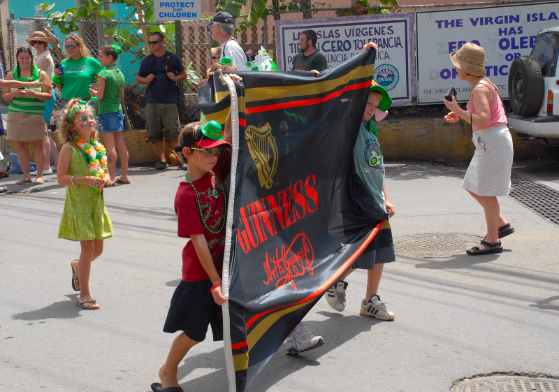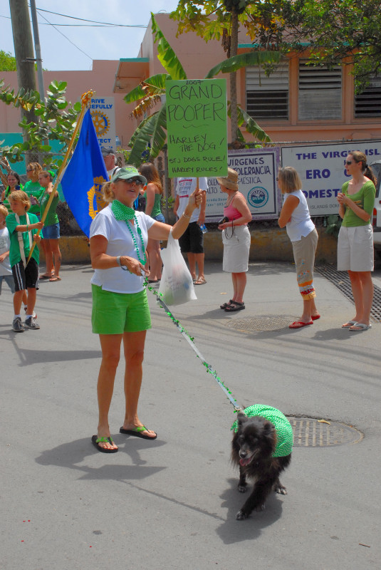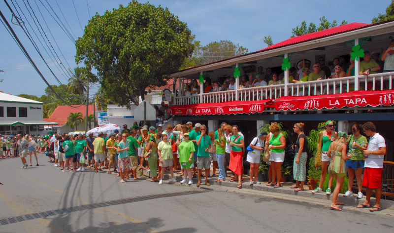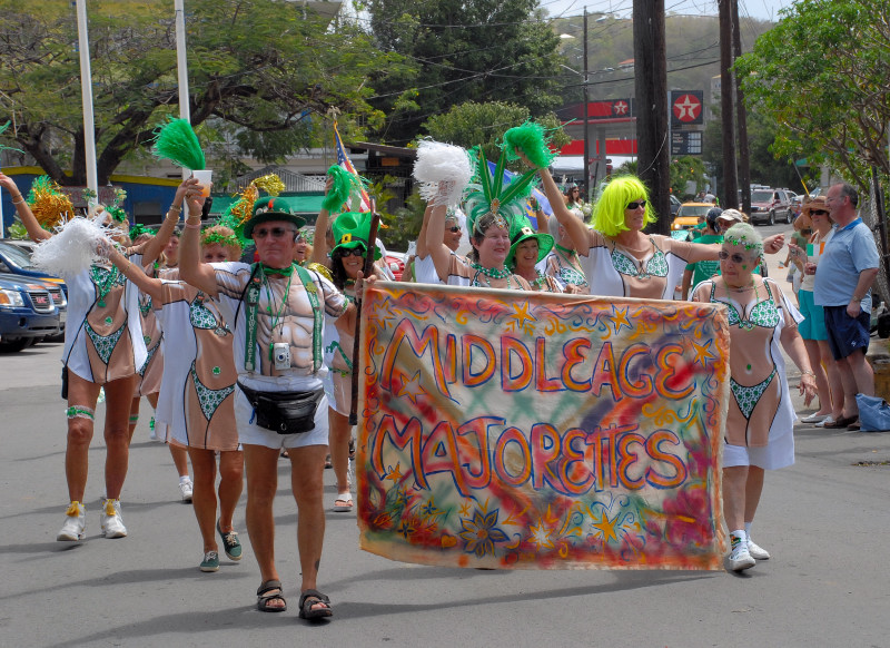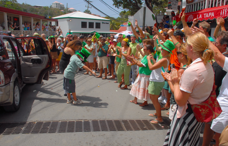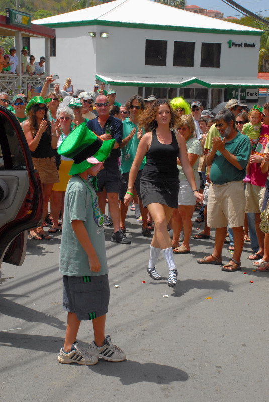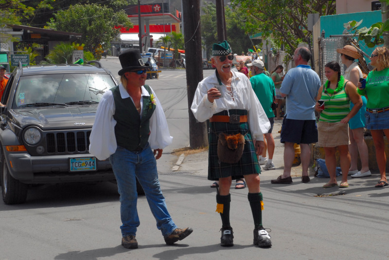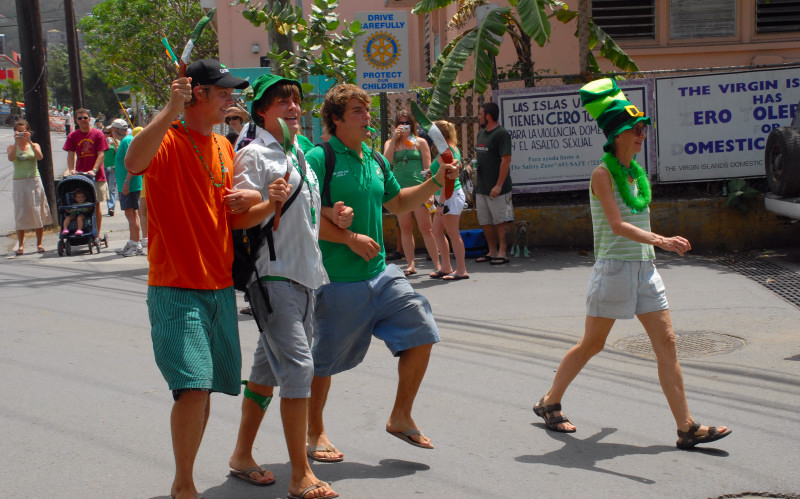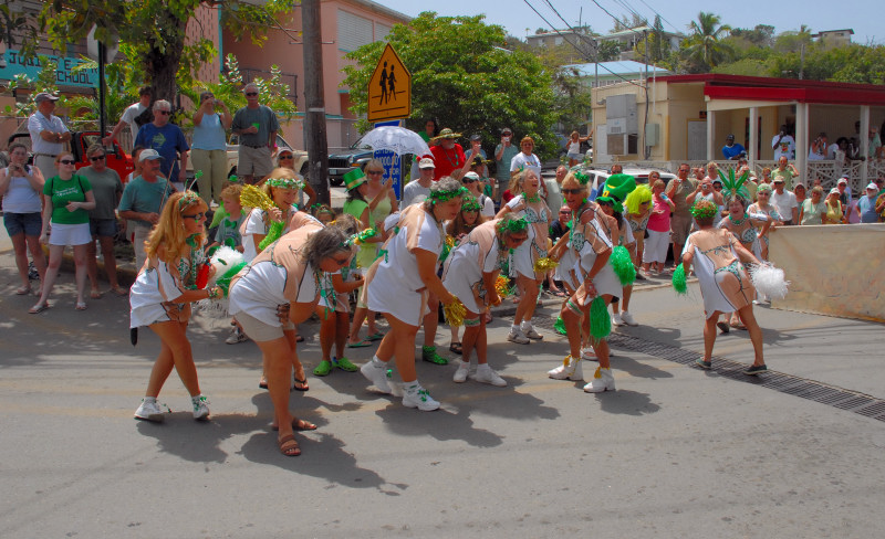 Cruz Bay, on the west end of St. John, has some very elegant shops and bars and restaurants, but the place retains a small-town feel. Steve and Vicki asked us to join them for breakfast at JJ’s on the morning of 3/17, after which we moved to the Quiet Mon bar and restaurant, where a large green-clad crowd, composed mostly of locals, gathered to watch the annual St. Paddy’s Day parade. Remember, we are formerly from Savannah, home of the USA’s second-largest parade, but I can truthfully say that I have never seen a St. Paddy’s parade more enthusiastically received than the parade we witnessed here on St. John. It was not a large parade, and it was not a long parade (about two blocks!) but it was a charming parade. We had a blast, as did all concerned. (See pictures, below.)