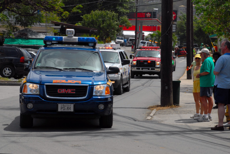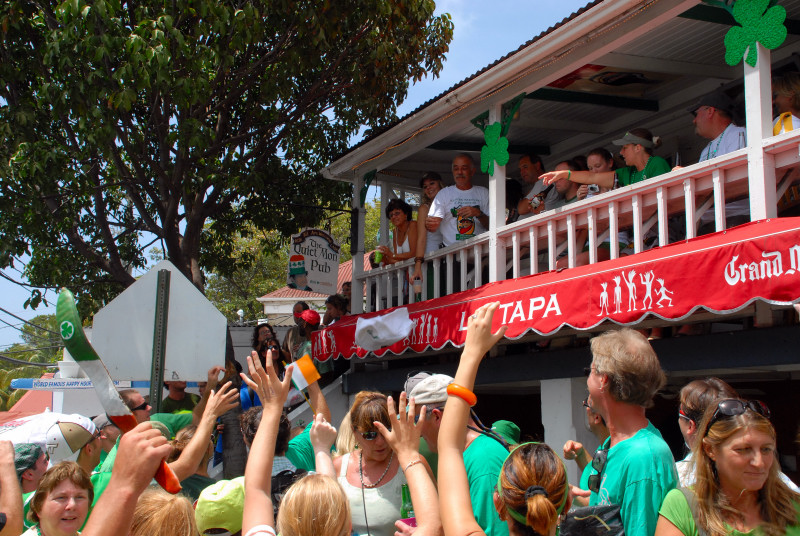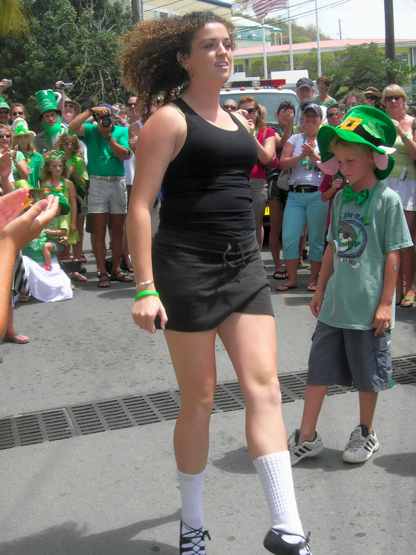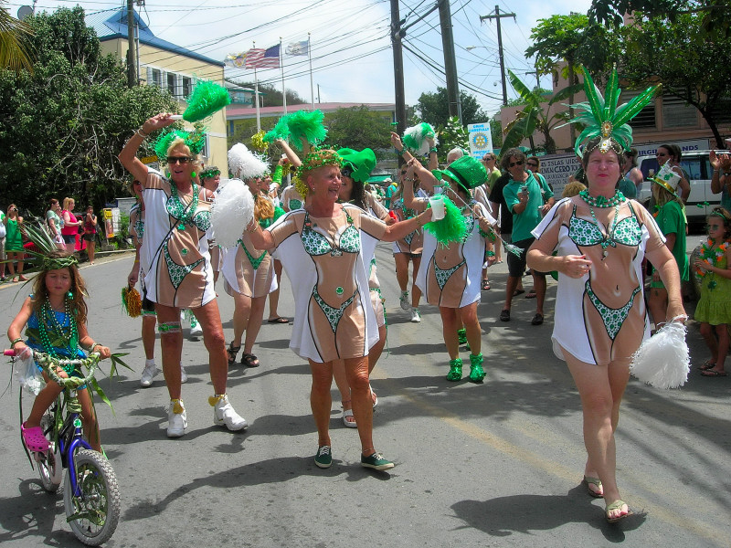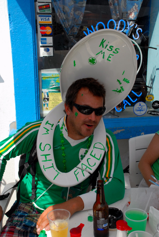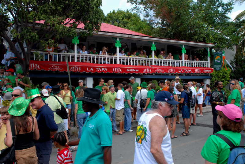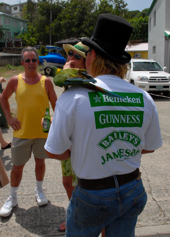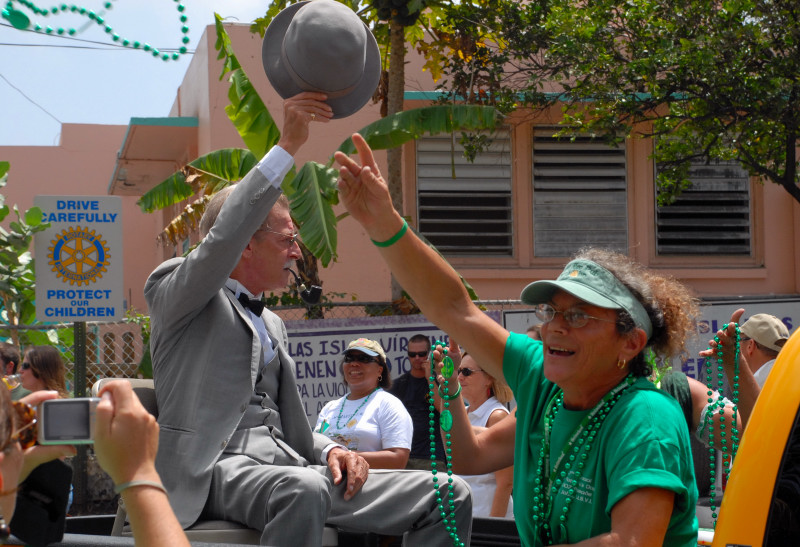 Cruz Bay, on the west end of St. John, has some very elegant shops and bars and restaurants, but the place retains a small-town feel. Steve and Vicki asked us to join them for breakfast at JJ’s on the morning of 3/17, after which we moved to the Quiet Mon bar and restaurant, where a large green-clad crowd, composed mostly of locals, gathered to watch the annual St. Paddy’s Day parade. Remember, we are formerly from Savannah, home of the USA’s second-largest parade, but I can truthfully say that I have never seen a St. Paddy’s parade more enthusiastically received than the parade we witnessed here on St. John. It was not a large parade, and it was not a long parade (about two blocks!) but it was a charming parade. We had a blast, as did all concerned. (See pictures, below.)