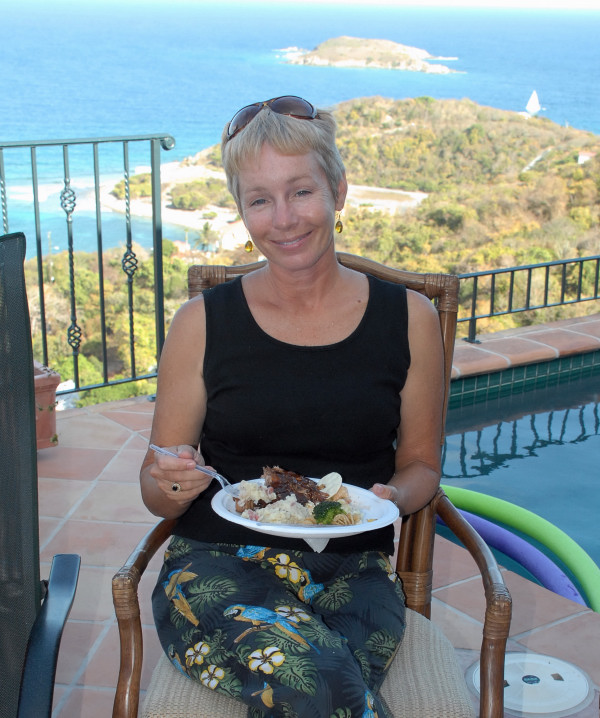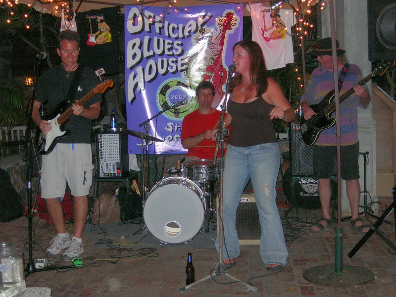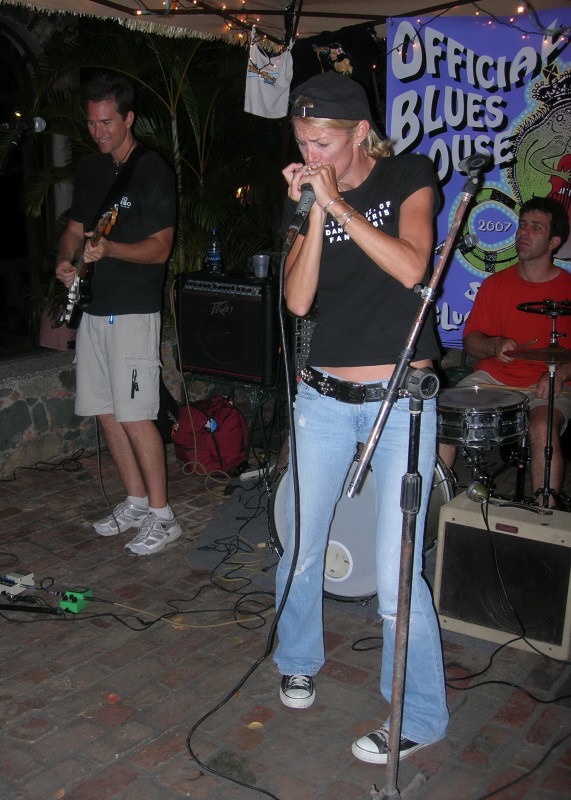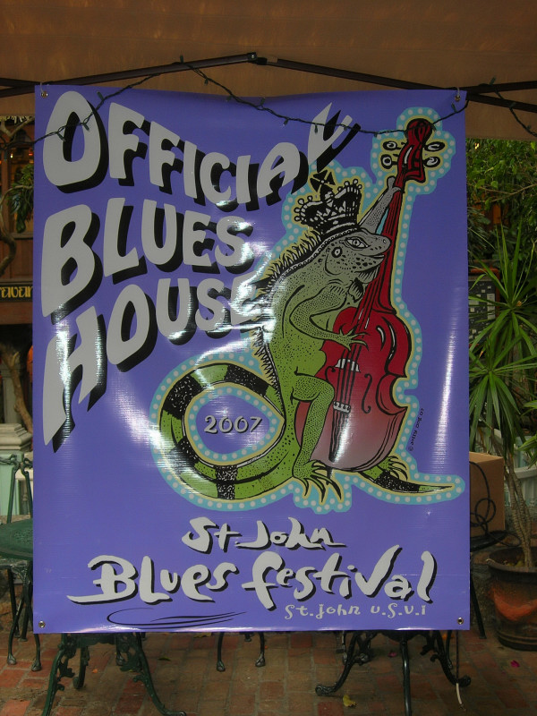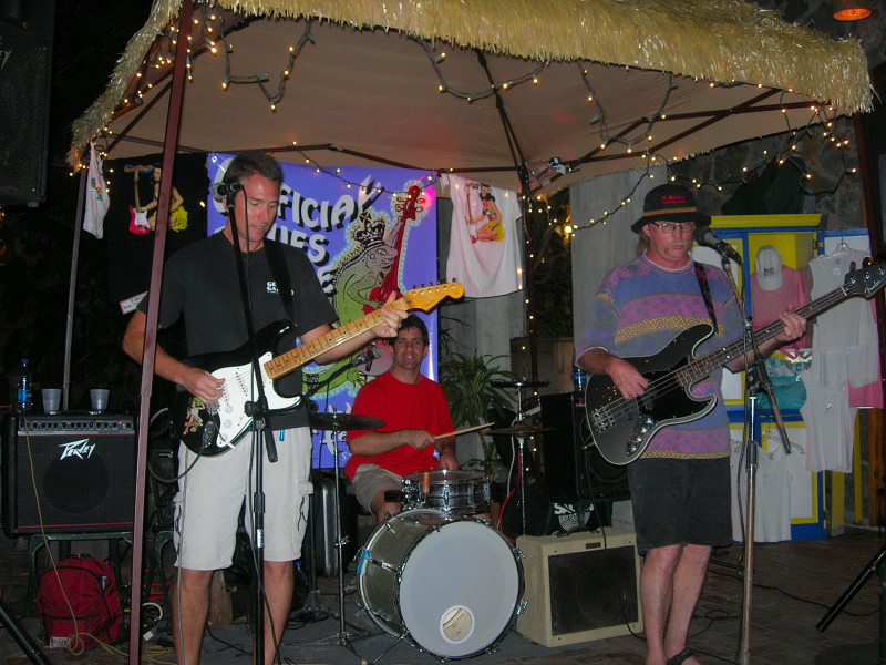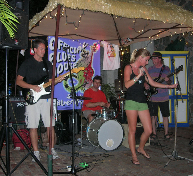 There was a blues festival during our stay, during which various blues bands played in various watering holes on the island. And then on Saturday night the grand finale: a major concert on the east end in an athletic field in Coral Bay. Great time. We have pictures taken on the first night at the Gecko Gazebo in Cruz Bay, but, sadly, neglected to take a camera to the big concert on the final night of the festival. And we had a nice meal with Steve and Vicki and Eric at Island Blues where we also listened to karaoke that was so bad that Chuck said that his toes were still curled hours later.