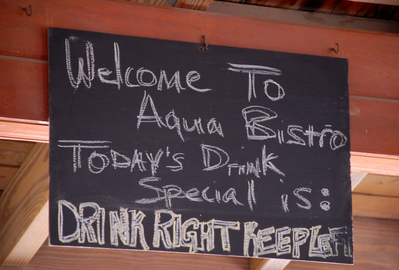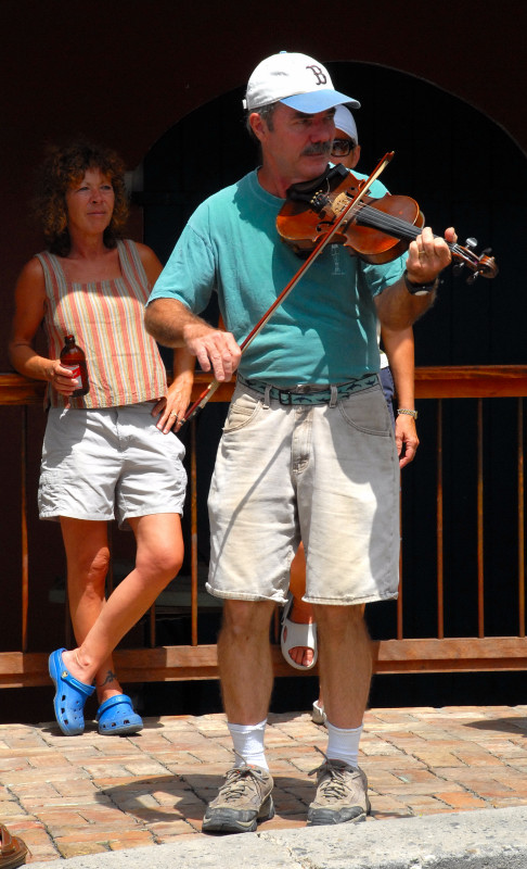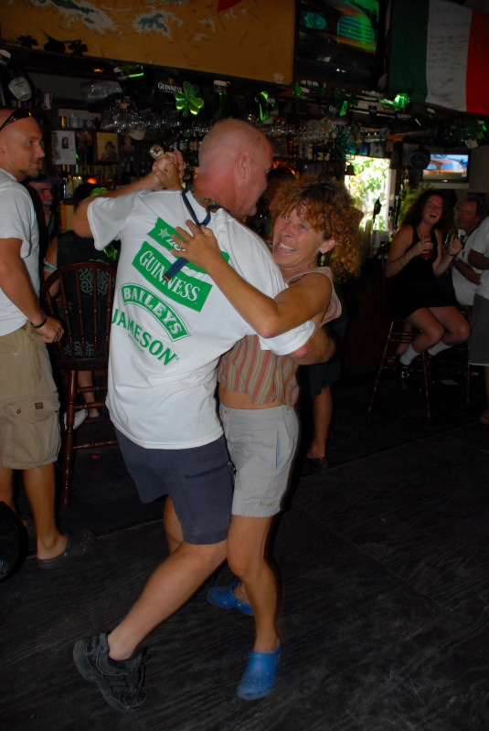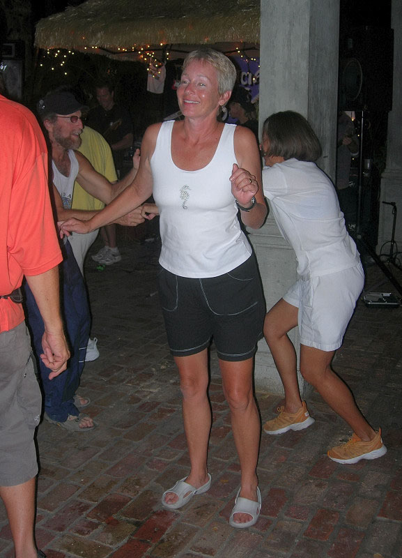 We could somewhat later hear, from our vessel in the opposite harbor, that the musical style had changed, but at the time we were there the rap-oriented songs didn’t appeal to any of us old fuddy-duddies, and so we took an early leave, with a brief backward glance on the part of some of us toward the sportfish, and elbowed our way off through the crowd to visit the Dinghy Dock Bar/Restaurant, where rumor had it there was to be another session of karaoke. Along the way, we heard the bongo drums in Mamacita’s, so of course we had to venture in to show Steve and Linda. Have I mentioned that during regatta there are lotsa folks around? We could hear the bongos, but certainly couldn’t get close enough to see anything, let alone see the bar or a place to sit, and so we continued our passage to the alleged karaoke. Found a table there, but alas, no active karaoke, and hence no chance to cajole Linda into a performance. (Rumor has it that she has a good singing voice.)