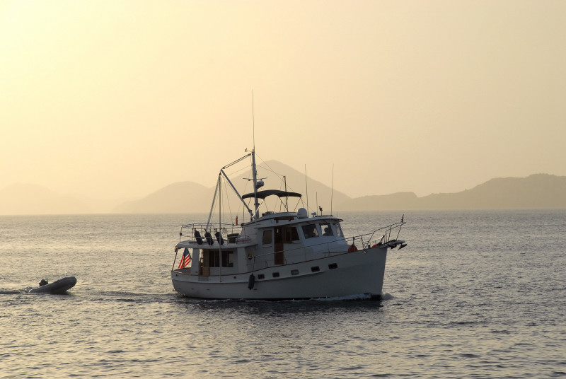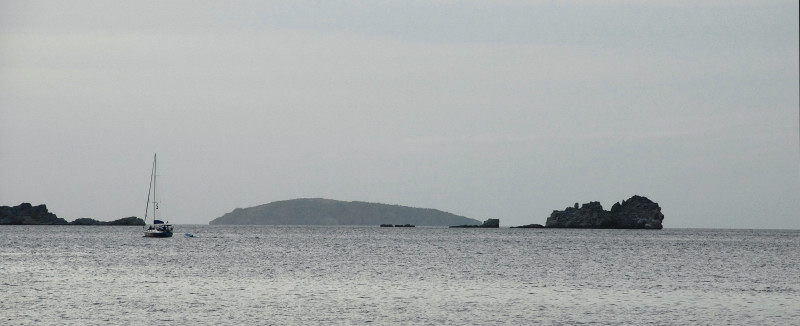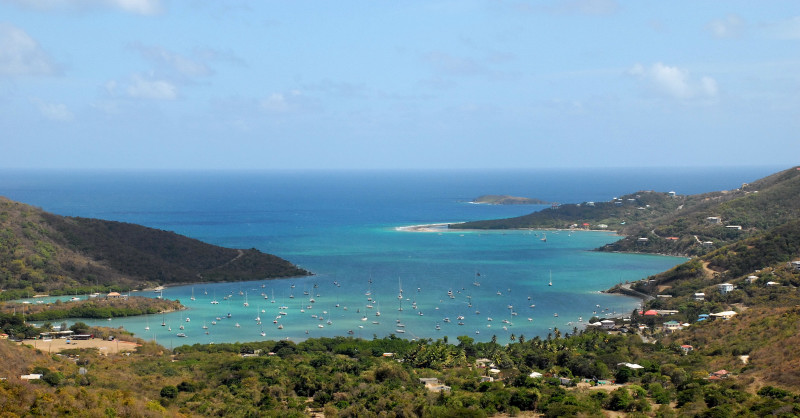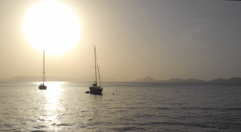 In our last posting, we were, as they say in Savannah, fixin’ to depart from Culebra and head toward the Virgin Islands. Events intervened. Friends Steve and Linda aboard Seaman’s Elixir fought headwinds and motor-sailed east from Puerto del Ray to Dewey. So we spent an extra day in order to spend time with them and experience more of the craziness that accompanies a sailing regatta. Lotsa extra people in town for that. Lotsa Heineken consumed. Big crowd for a free concert at the ferry dock, where for us the behavior of the Puerto Rican boaters was at least as fascinating as anything happening on stage or in the crowd. You see, the normally near-vacant harbor and bulkhead were jam-packed with boats of all sizes. Boats kept arriving and just rafting up with the boats already there. No asking for permission, no communication whatsoever, as far as we could see. Just jump aboard the boat already there, tie up to their cleat, and then use their boat to jump to the dock, or another boat closer to dock, etc., until one could reach the dock. Does this sound sneaky, as if the tied-to boat didn’t even know about the new arrival? No es verdad! On the contrary, you silly gringos! For example, one of the tied-to boats was an expensive sportfish, filled with semi-nude nymphets gyrating to the music from the nearby stage, and also salted with a few hombres with beer bellies. Gyrating on board apparently carried great status; there were a number of young nymphets up on the dock also in a state of near undress, engaged in sadly tentative and hopeful gyrations that were clearly aimed at the sportfish. But I digress. The point is, the tied-to vessel was perfectly aware of the un-invited tie-up. Their only reaction was to send one of the beer bellies up to tie a self-protecting fender between the new arrival and the host ship.