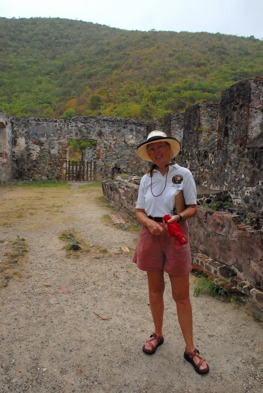 On 3/19 Steve met us in Cruz Bay and took us for a driving and hiking tour of the east end of St. John. We had never seen highways with slopes so steep. Maybe a short driveway at a residence, but not a road functioning as the main road. St. John contains the ruins of over 100 plantations and sugar mills and rum factories. One of the most restored (and cleared) and accessible – the steep road leads right to a parking lot -- is the Annaberg Sugar Mill, where we enjoyed the trip back in time and spoke with a very knowledgeable docent. Steve maintains of a couple of the island’s extensive (and challenging) trails as an unpaid volunteer, and we also took an extended hike down (and up) a couple of “his” trails, thereupon visiting several overgrown ruins. The trails were a very enjoyable outdoor experience – the kind of thing we like to do -- but the ruins were a terrific “bonus.”