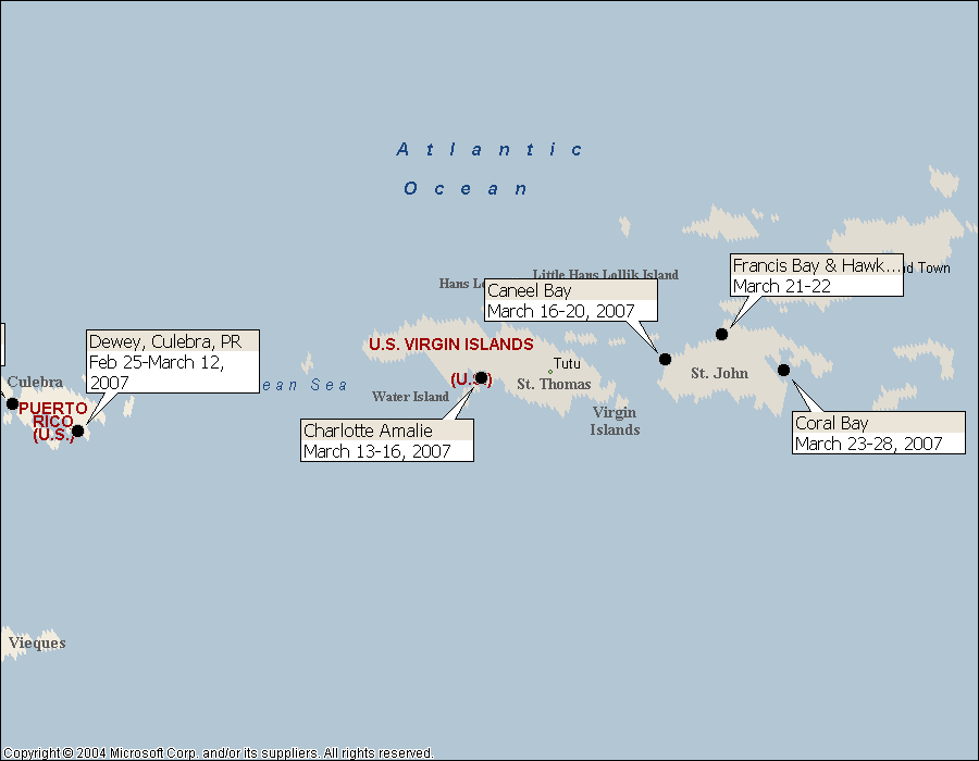 St. John is perhaps the most striking island we have yet visited. The island (and its immediate neighbors) is steep and lushly green. The water seems extra clear. (Barb and I had a nice scuba dive the afternoon of 3/18/07 and another on the morning of 3/20/07.) Most of St. John is a federal park, thanks to the beneficence of Laurance Rockefeller, and hence it has mostly been spared the development that is so evident on the steep hills of St. Thomas. Most of the bays have park service mooring buoys, placed there in order to protect the coral reefs. Good thing – there are oodles of at-best-semi-competent cruisers here on charter vessels. The prerequisites demanded by the charter companies are apparently quite modest. For example, we heard one story about a charter boat that radioed back after four days and asked to be sent more anchors: their boat had been equipped with “only” four and they had now run out with three days remaining! And there was the sailing vessel on charter that radioed back a frantic call for help – they had mechanical problems with their engine and were stranded. The charter company asked them why they didn’t just sail back. The response? “Sail -- we don’t know how to sail!”