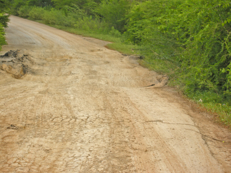 every low spot the asphalt has disappeared, leaving ugly and deep pot holes. At several points near bridges the road was covered with water. In