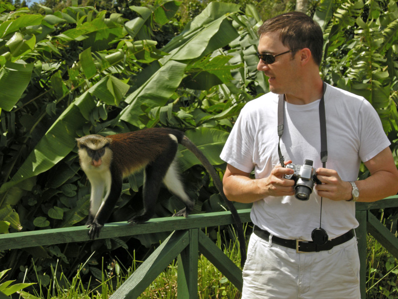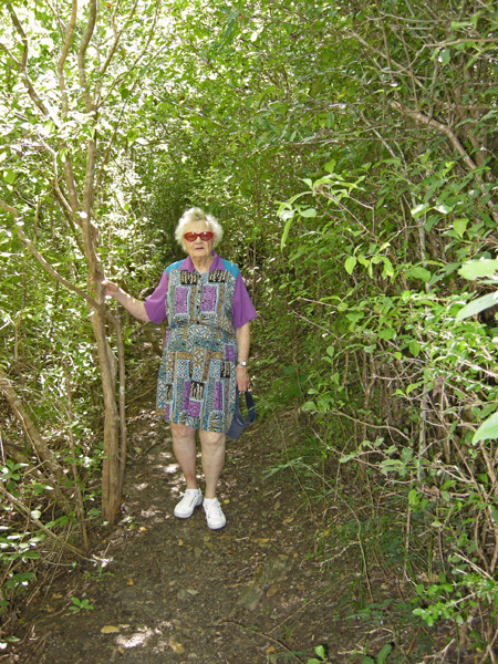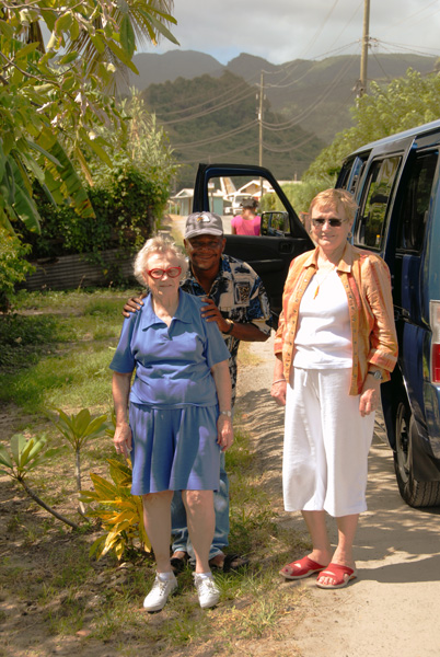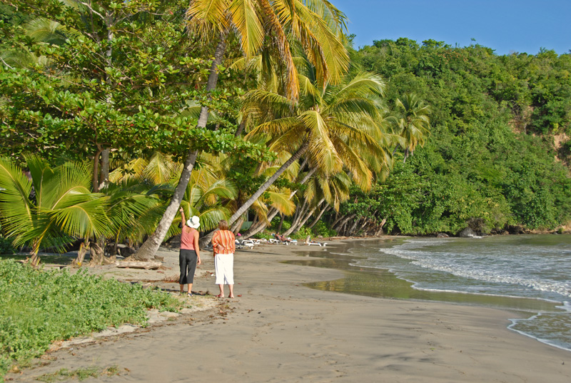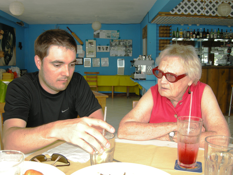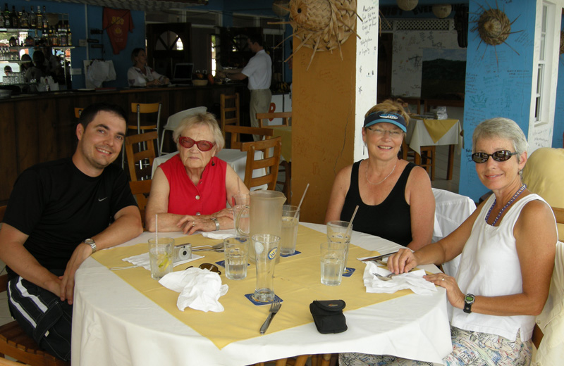 My (Chuck's) mother (Evelyn), sister (Zona), and nephew (Erik) came to visit us in Grenada during the period December 10 through 17. We all went on a tour of the island with our favorite tour-master Cutty. It was my third such tour, but with the good company and Cutty's easy-going but jam-packed itinerary it was still fun. We took taxis into St. George so the girls could shop for mementos and Barb could get some groceries from the market. On one occasion we returned by bus so our guests could experience the driving and crowding. Erik and I did the Hash House Harrier run while the girls went to a potluck at Clarkes Court Marina. My knee complained a little during the run, and a lot afterwards -- it looks like my running days are over, unless I can get it repaired one day. Sunday morning we moved the boat from Clarkes Court Marina (where we were very pleased to find that the side gate of our cockpit was at exactly the right height relative to the floating dock, and so Mom could easy get on and off the boat, a not inconsiderable concern for an 89 year-old woman) over to the anchorage at Hog Island, the better to access Roger's Sunday heaped offering of barbequed chicken and five or six provisions, and also the better to give our guests an "at anchor" experience. We had a delicious lunch at BB's in downtown St. George, and another nice lunch at Le Phare Bleu, where Zona and Barb availed themselves of the pool. We had a French dinner at Whisper Cove, where we were surprised to discover that Marie and Luke have returned to France for good, and have been replaced at the restaurant by an energetic (um -- frantic?) French couple whose eagerness to please is matched only by their almost total lack of English. They were still using Luke's printed menu, but we had to point to our selections. Some of us ordered rum punches, but got Ti punches. (Cf. here for a description of Ti punch.) Later, Erik tried again for a rum punch, and got what looked like a rum and coke. Barb and I shared a salad, and had an interesting time attempting to ask for an extra plate. But the new proprietors are indeed eager to please, and the food is at least as good as it was under Luke. But if I were spending any extra time in Grenada, I would volunteer to teach them a little English. Words like "water", "plate", "punch", and "bread" would immediately be of some use.