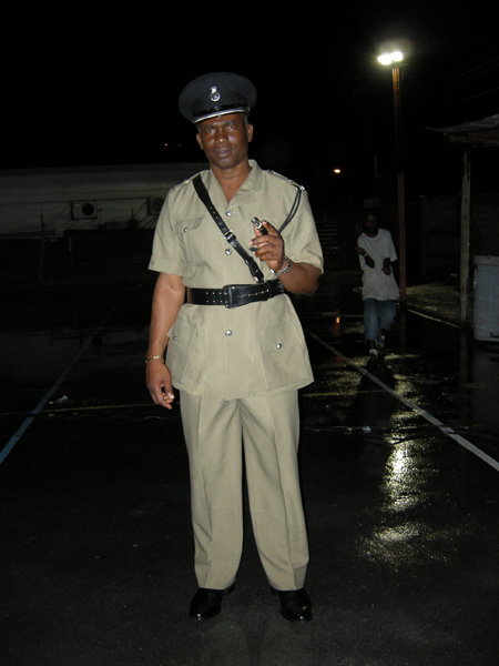 There were at least three camera setups on impressive tripods, with photographers documenting the speeches and the subsequent musical acts for posterity, or at least for transmission on TV, which isn't really the same thing, is it? They popped in and out of our awning, depending upon how much rain was falling on the court. If it rained just a little, they stayed in the court and used umbrellas over their cameras. If it rained a lot, they moved under our awning. Notice that I said "our" awning, for indeed it truly became "our" awning when I ventured out to fetch a couple of the wet plastic chairs that were sitting unused in the foreground of the court. It became "our" awning when the hostess who had been taking drink and food orders from the mm's gave me a large white rag with which to wipe the rain off the chairs, and when she raised no objects when we switched from standing behind the mm's to sitting behind them. Oh, I tell you we were feeling pretty smug. At least until the musical acts began. For then it became apparent that on the first night of the three night parang festival, anyone with any interest in performing any Christmas-related song whatsoever had been welcomed by the program committee, without regard to any possible connection with parang. So we heard a variety of Christmas carols -- such as Silent Night or White Christmas -- sung by children's groups at about the same level of musicality as a grade-school Christmas program. Indeed, some of the groups were grade-school groups. Others were from Lady's groups, but at a not-much- higher level of musicality. And then, a small pause, and an urgent plea for the members of a local parang group to assemble themselves on the stage. Keep in mind that because of rain delays by this time we are many hours later on the program than we would have been otherwise. Perhaps the program committee had neglected to provide the acts with the program. In any case, after another pause, the master of ceremonies returned to the stage to announce that since not all members of the local group could be found, and since another group was ready, the ready group would instead perform. The group was good. They had good voices, possessed some of the traditional parang musical instruments, and were fun to listen to. To my ears they didn't really sound like "parang", but no matter. But by this time it is 12:30 AM, and we had been told that the maxi-taxis only run until 1 AM. So we listened to a few numbers, and then quietly left our awning. It was raining softly but we had umbrellas. Alas, what we didn't have was either a maxi-taxi or a conventional taxi. The taxi-stand area was deserted of taxis. The few bystanders staggering about seemed to be surprised that anyone would want to catch a taxi at that time of night. And then suddenly one of the bystanders says he has a ride for us, and stops a car and tells the driver to take us to Tyrrel Bay. "It is ok," he says. "The driver is a policeman here on the island."