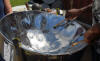 pan maker demonstrates with a pencil instead of a punch, since, as he explained,