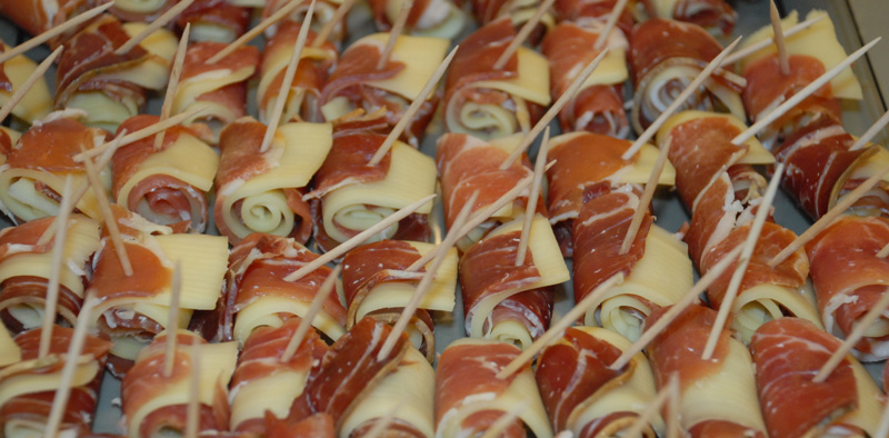 One of the serving tables with cheese/ham sticks, gravoerret, rakfisk, lompe wraps, and potato salad