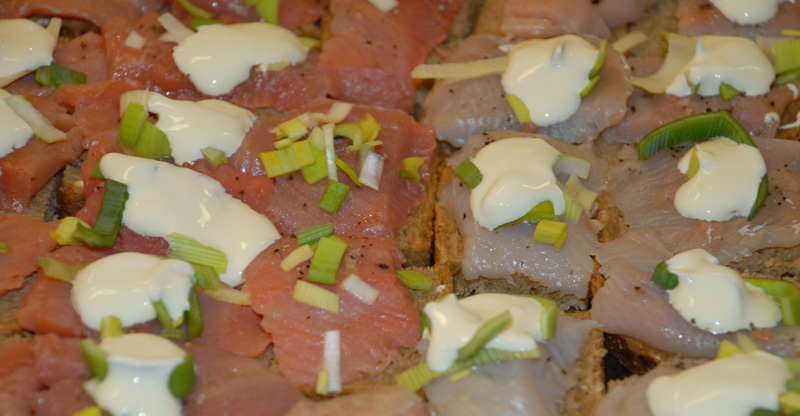 Lompe wraps (small lefse with cream cheese, chopped leeks, and smoked salmon)