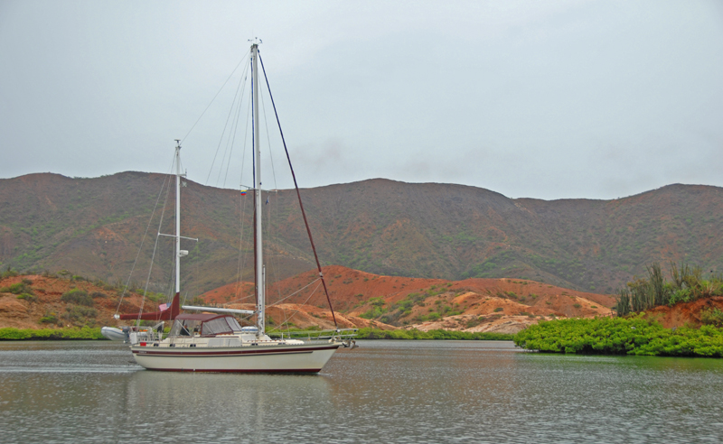 Some of our party were headed to Puerto La Cruz, and we, along with Livin the Dream, were headed to Laguna Grande, a large and scenic bay along the northern shore of the Golfo de Cariaco. Not sure if the PLC folks got tucked in before the storm hit or not. We sure didn't. Suddenly, a squall hit and we were in winds up to 45 knots. Lasted for at least an hour, and really kicked up the waves. By that time we were in the process of swinging east into the Golfo, so we were headed pretty much right into the steep and close waves. Waves "only" 5 or 6 feet high, but very steep and close together. So we did some pounding. Tusen Takk II took it like a champ.