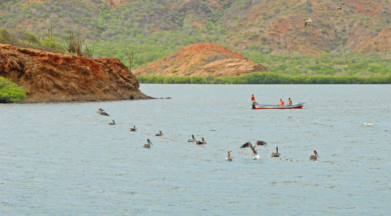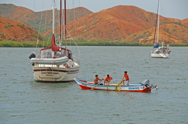 By the time we approached the mouth of the bay, the squall had passed and the waves had subsided. By that time Livin the Dream was about an hour behind us. As we passed the last small fishing settlement before the opening, a pirogue came speeding towards us. Oh oh. Get the flare gun. Check with the binoculars. Do they look armed? Do they look ferocious? Nope. They look young, and they look curious. Yup, that's it. Their curiosity satisfied, they swung off and headed up the Golfo. Whew, being in Venezuela is going to take some getting used to.