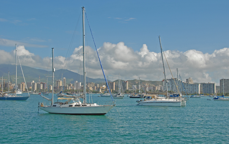 Barb brought back bunches of supplies and equipment when she returned from the USA. But it turns out that during certain "busy" times of the year, the airline will not permit the checking of more than two bags. Oh oh. The bearings are going out on the motor or winch (or both) of our power davit -- used to lift the dinghy up and down to/from the upper deck -- and our third package was a new electric motor and winch that, when packaged, weighs 42 pounds. So she had to leave that package with our daughter Danielle in Savannah. But we have found a solution to getting the package down to the Caribbean. There is a company called Tropical Shipping that ships all over the Caribbean from the States. We had Danielle send the box to Tropical Shipping in Florida who in turn has put it on one of their freighters for a week-long voyage to Grenada. Since we are now in Venezuela (where Tropical Shipping freighters do not go), friends of ours -- who are still in Grenada -- are picking it up for us and will bring it to Venezuela in mid August. In the meantime the bearings on our davit motor are protesting mightily each time we use it. We have begun lifting the dinghy manually via block and tackle with the boom, but that setup is less than ideal since it takes us 15 to 20 minutes instead of the usual three. The problem is not so much that there is a lot of cranking, but rather that we only installed one hand winch and must use it to wind two different sets of lines -- one to lift the end of the boom, and one to lift the object dangling from the end of the boom. Each line has its own lock/clutch, and lifting the dinghy is a complicated task involving lifting one line for a while, locking that line, switching over to the other line, lifting that a while, locking that line, switching back to the other line, etc., back and forth. Also, since we have to lift the dinghy every night to ensure that it is not stolen, we have taken to lifting it out of the water with the boom and hanging it against the rub rail each night. That process involves only one line and is very simple and takes only about two minutes. We only put it all the way up on deck when we are traveling or are in Margarita -- see following section for the reason why.