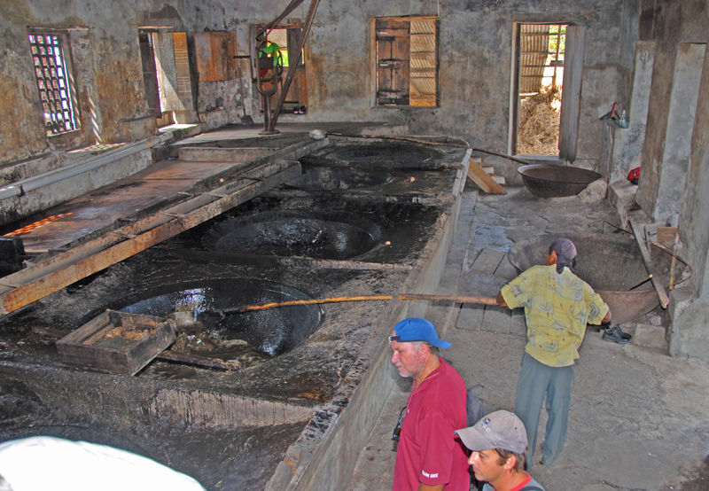 Squeezings go into the first copper kettle, are heated/reduced, and then trasfered by hand to the next kettle, etc.