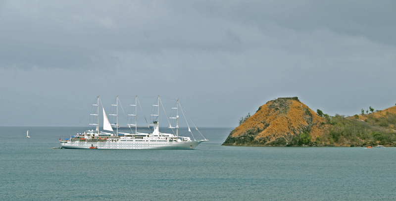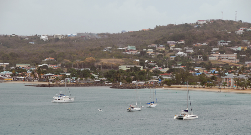 Two of our neighbors in the inner lagoon were Tito and Roberta (Halleluhia) who we had met at Cruise Inn in Trinidad. They told us about the St. Lucia Yacht Club, which has membership opportunities tailored to transient cruisers, but that also welcomes non-members. We attended several times, including a nice pot luck. On Easter we impulsively popped in to a restaurant whose billboard trumpeted an English meal with roast beef and Yorkshire pudding. On a scale from one to ten, Phyllis (Cocoon) still gets ten, and the restaurant gets two. After the rollers had passed and we were back outside in the bay, our friends Steve and Ann (Receta) arrived and we have shared a number of delicious meals (one home-cooked by Ann, one at the Indian restaurant Razzmatazz, one at the Pork Palace in Babonneau, one at the Thai restaurant Ku De Ta, and one at the Coal Pot in Vigie) and a number of competitive games of Progressive Rummy. We have gotten to know the folks on Never Never Land and Dorothy Ellen, and have run into many folks we have met along the way. Some anchorages sometimes feel crowded, but it really is a small community of cruisers out here.