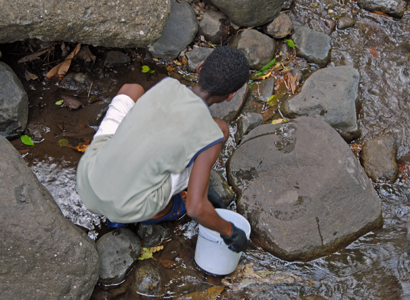 Young boy looking under rocks for (edible) fresh-water crawfish