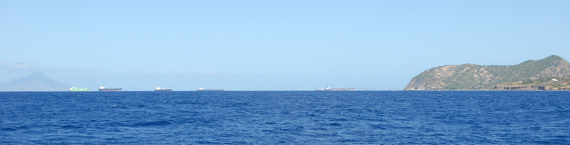 Approaching Tumble Down Dick from the south -- note the oil tankers anchored off the bay