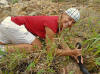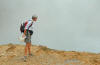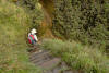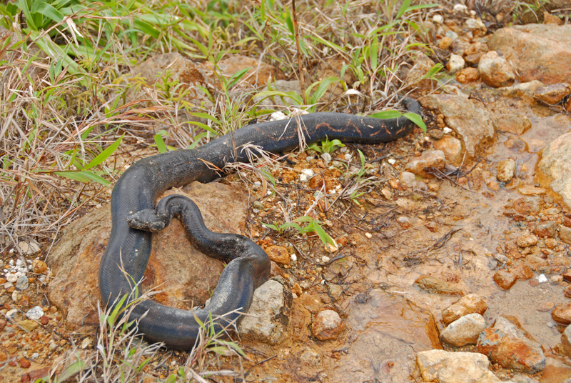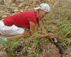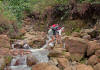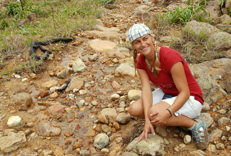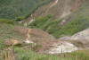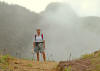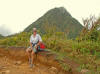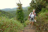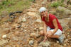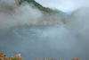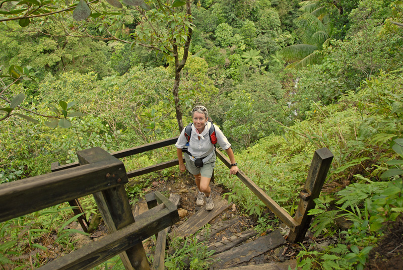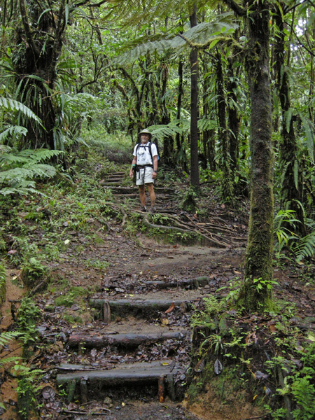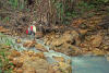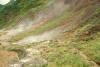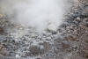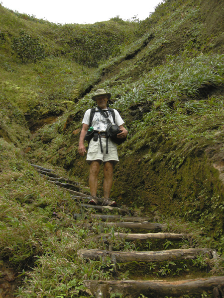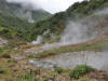 Sea Cat's assistant Desmond had promised to pick us up at shortly after 7 AM and take us to shore so we could catch a maxi-taxi bus to the trailhead to the Boiling Lake. When he hadn't shown by 7:45 Barb called Sea Cat and he came out and took us to the pier in front of Ft. Young Hotel. We walked from there to the bus station near the Botanical Gardens, where we were told that the bus would not be there until 9 AM. Darn. We had just settled in for a long wait when a maxi-taxi stopped with a passenger at the corner. Barb asked if it were going toward the trailhead, and the driver indicated that was not his route, but that he was willing to go for $60 US. When Barb talked him down to $15 US, we jumped in and were taken on a narrow twisty mountainous road up to the trailhead near the entrance to the Mountain Tram. So by 9 AM we began the hike described by cruising guidebook author Doyle as a 7 to 9 hour round trip, although we had also heard a time of 6 hours. The first quarter of the hike was through dense forest over a well-maintained path that rose fairly gently. Lots of boards and logs placed as steps, but occasional flat places were muddy. The second quarter or so was much steeper, along a path that traversed a rising ridge from which we could hear through the trees noisy rivers far below on both sides. The third quarter was up and down: way down to a river to be crossed and then way up and then way down to another river, and then -- well, you get the idea. And then a very steep descent into the Valley of Desolation, with its steaming vents and sulfurous odors and bubbling mud-holes and lack of vegetation. Just as we reached the center of the desolate valley we were overtaken by a young Czech girl/woman and her local companion who was serving as her guide. And just as they overtook us, the guide uttered a loud profanity. And no wonder, for there along the path was a boa constrictor. The guide was as amazed as the rest of us, for he had never seen such a snake in that unlikely location. He took pictures of the girl -- who later told us she was crew on a yacht that was in St. Martin, and had flown in for a quick holiday -- as she teased the snake, and so I grabbed the chance to snap a few as well. The path got harder to follow as we left the Valley of Desolation and followed along and across and along and across a stream bed that was running with warm/hot water white with minerals. No signs, and no indications of where the path was. Maybe that is why so many folks recommended having a guide, including Doyle. But Maggie and Dean (Rain) had gone without one just a few days earlier and told us there would be no problem. So we carried on and found our way. (The youngsters had left us so far behind that they were no help.) The Boiling Lake was indeed. Boiling, that is. The lake steamed so vigorously as to totally obscure the surface down in the 50-foot-diameter crater. But then the winds would shift and swirl and sweep the steam briefly in the other direction, and massive roils could be seen, in this, the world's second largest boiling lake. Awesome, and well worth the effort to get to it.