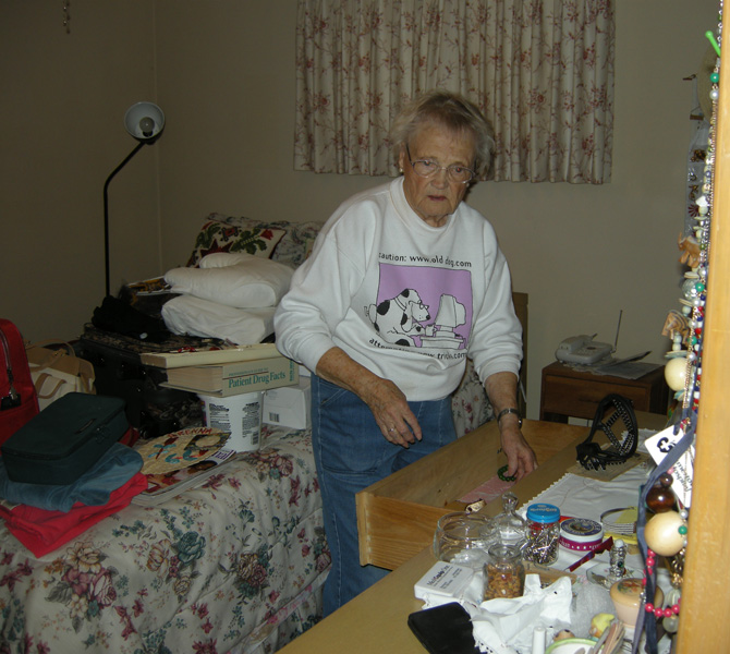 We were both scheduled to fly to Vegas, but then Chuck decided to go ahead with his knee surgery, so after the surgery I went on without him. Chuck stayed in Bismarck initially and then when his recuperation seemed to be going well went to Jamestown with his mother Evelyn to help her move out of her house of 45 years. I flew back to North Dakota to see Chuck and to help Evelyn prepare for a garage sale the week-end of October 2nd. At the garage sale Evelyn sold/got rid of/gave away a lot of stuff, but still ended up with a lot left over. On Sunday, the 4th, Chuck drove me back to Bismarck to catch my plane back to Las Vegas. While standing up that evening Chuck exclaimed that his knee felt strange. Within a few minutes the knee was swollen to twice its size and Chuck was in a lot of pain. In a quick call to a very sleepy surgeon we were told to come in to the clinic the next morning. At that visit Chuck was chastised for doing too much too soon on his knee. He had apparently traumatized it by all the lifting and carrying of stuff at his mother's and the knee was full of blood. A physician’s assistant removed a bunch of blood and sent Chuck home on crutches with orders to keep the knee iced and to stay off of it. Since Chuck couldn't go back to Jamestown to help his mother, I delayed my trip back to Las Vegas and returned to Jamestown to help Evelyn and her friend Vivian with the post-sale and pre-move cleanup. We packed up and hauled three truck loads of stuff to Goodwill, contracted with a realtor, set a price for the house, got it on the market, and had it shown before I left. During all of the packing, etc., I was surprised to discover that Evelyn had more stamina at age 90 than I did. She was still packing at 10:00 pm when I was ready to collapse.