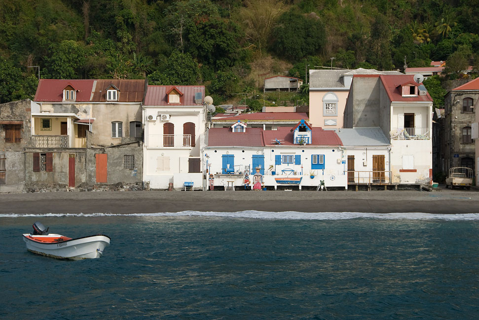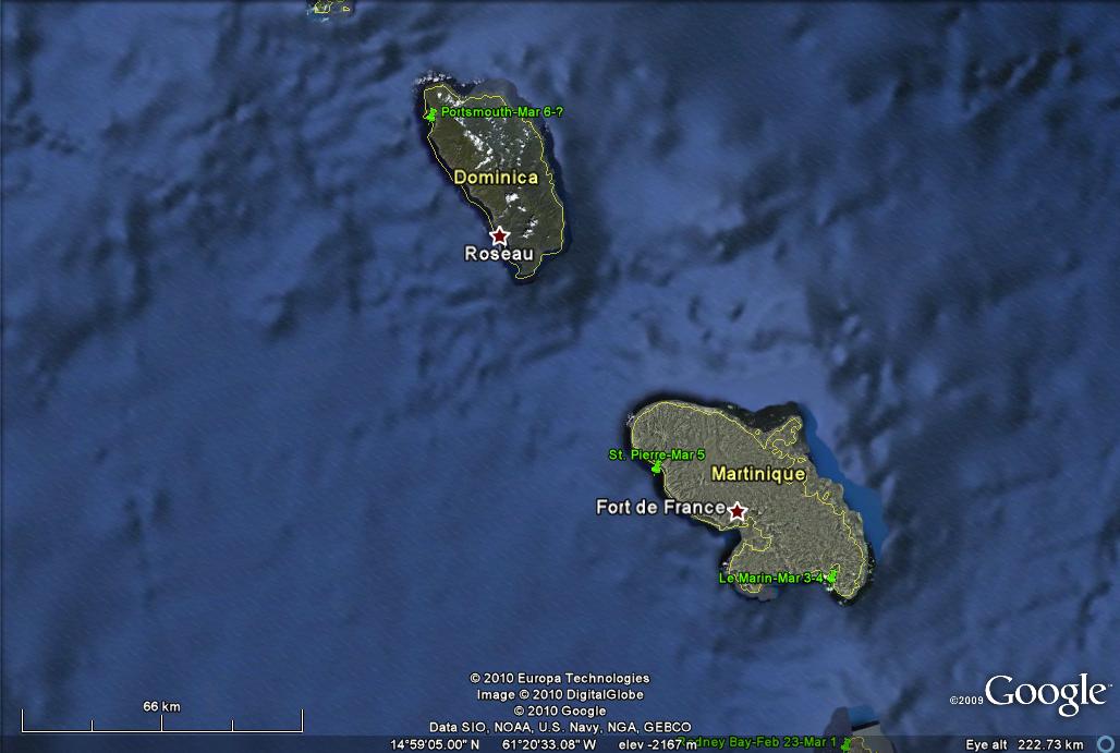 On March 5 we moved up to Ste. Pierre, where we found the anchorage to be VERY rolly. We had checked out of Martinique at Le Marin, so we didn't need to go ashore. Good thing. Taking the dinghy down from the upper deck would not have been fun. Did I mention that it was rolly? We deployed one of our flopper stoppers, and discovered the next morning that it had been jerked so violently that one of the four chains that run from a central ring to the corners had severed. Oh, and we arrived at Ste. Pierre well before Arctic Tern.