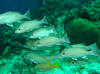 On Sept. 21, Barb rented an underwater camera for 24 hours. For her first experience she chose to somewhat low-ball it ($70), in that she rented a housed point-and-shoot digital camera with an external flash. She found the experience rather frustrating, since the camera would not focus very close, the "close-up" setting not withstanding. So in addition to the typical beginner's pictures of the tails and tops of fish that didn't hold still for their portraits, she also got a lot of well-composed pictures that were out of focus. Here are some that survived the editing process. (The few taken by Chuck are marked with a *.)