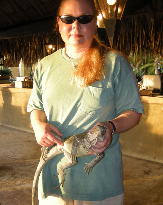 Daughter Lara has joined us for a week's visit. She is a veterinarian with no compunction about handling animals; as we awaited our dinner to arrive recently at Buddy Dive, she suddenly showed up at the table with an Iguana she had reached down and grabbed.