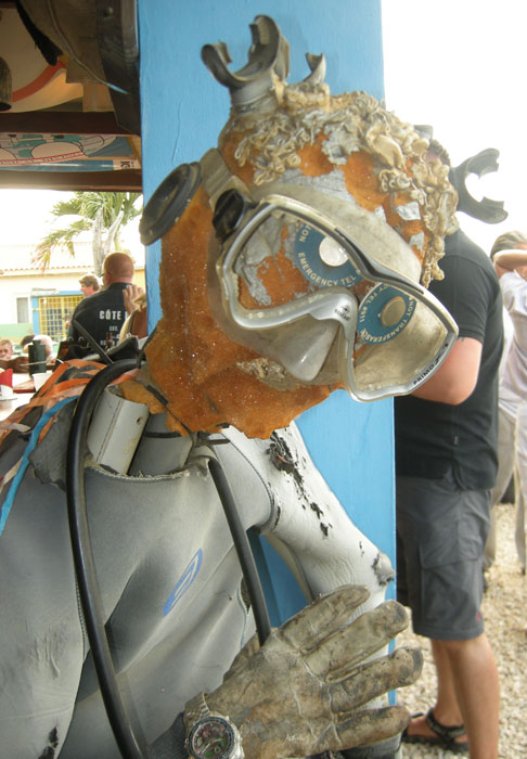 Yellow Submarine Dive Shop recently sponsored an underwater cleanup in the vicinity of Bonaire Nautico Marina; afterward they threw a free BBQ at their shop for all participants. In the associated raffle drawing Lara won a pair of gaudy (too large) shorts which she traded with another winner for a key chain.