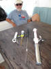 In the picture below, Mike shows the hunting outfit he has fashioned. On the left, a piece of PVC pipe that serves as a scabbard for the saw beside it and also serves as an extension to the handle for the saw. The next item is a wallboard saw that they are using to kill the fish after they get one on the spear. The third item is the spring-loaded spear, and the fourth item is a scabbard for the spear. One end of the scabbard is composed of a rod holder, and this is used, if necessary, as a bludgeon.