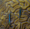 Now, the campaign his morphed. The ribbons are still available, but are no longer emphasized. Instead, the Marine Park has secured (and is continuing to secure) a supply of for-the-purpose spears that are to be used on the Lionfish. Bonaire has long been known for its policy of "no spearing of fish", so this marks quite a departure. But there are major safeguards. First, the spears are very short, and are powered with an internal steel spring rather than a rubber hose. Their range is so short that the would-be spearer must place the business end of the spear almost right up against the Lionfish. This is possible, because, unless the fish has been shot at and missed, it has no fear of the diver or the spear. The small three prongs at the end of the spear have no barbs, and so the hunter must be careful not to lose the fish after spearing it. He or she must also be very careful not to touch the tendrils of the fish, since they are highly toxic and sting like the dickens. The Marine Park provides the spears to divers only after they have undergone a training session, so they are not yet generally available. Michael and Suzi (Awakening) have undergone the training, and possess one spear, which they trade off in using when hunting. As of this posting, they are the proud killers of 32 lionfish.