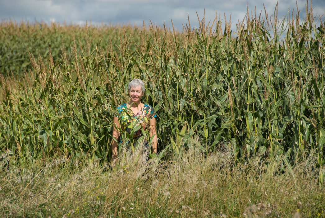 Barb crowds up to a corn field so we can judge the height of the crop