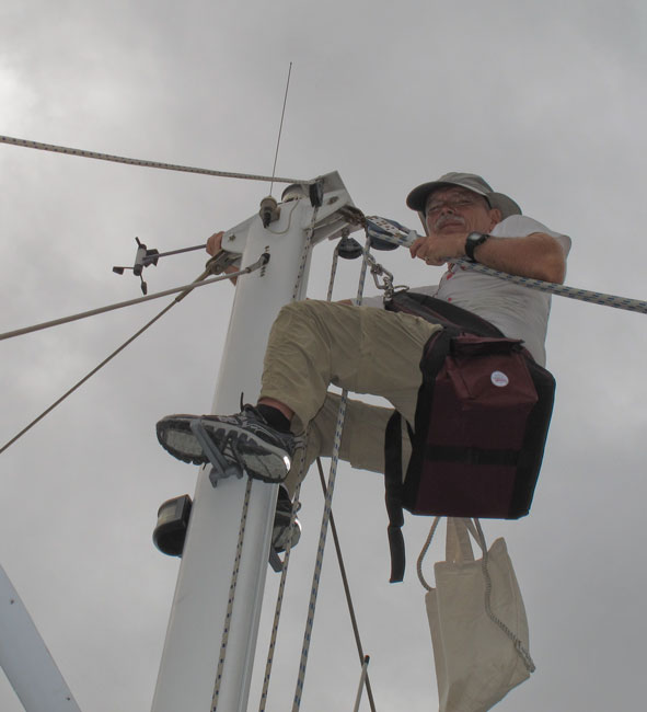 and so I sat in the bosun's chair and Barb winched me up to the top of the mast,
